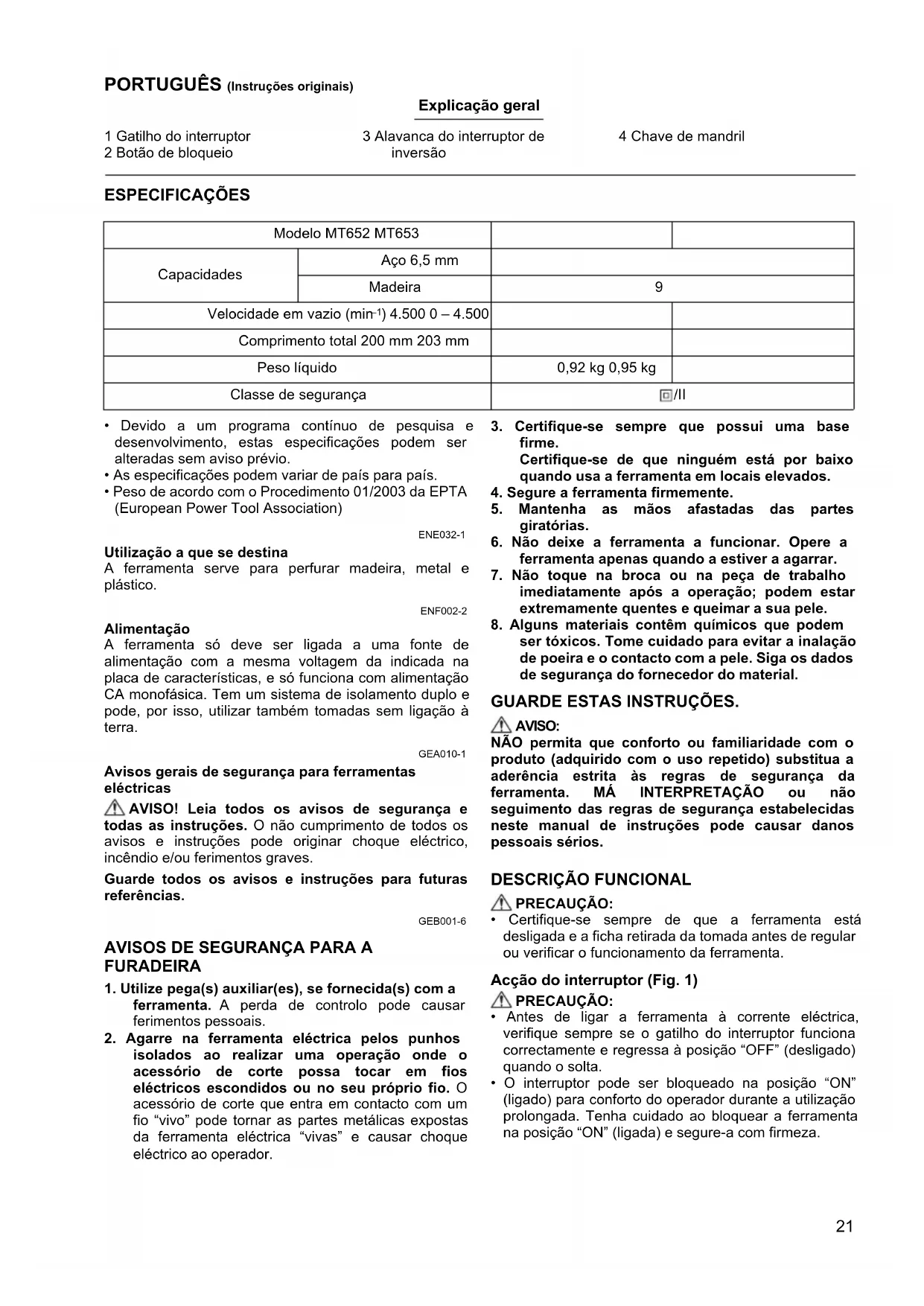 Encontre gratuitamente o manual do aparelho MT653 Maktec em formato PDF.