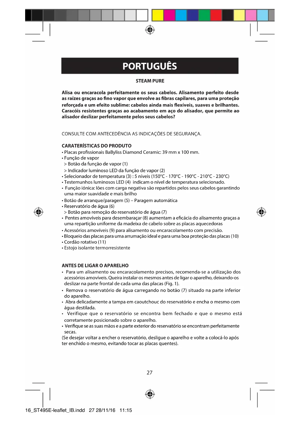 - Guarde el alisador con las placas cerradas para protegerlas ecazmente con la ayuda del sistema de bloqueo de placas (10). 16_ST495E-leaflet_IB.indd 26 28/11/16 11:1527 PORTUGUÊS STEAM PURE Alisa ou encaracola perfeitamente os seus cabelos. Alisamento perfeito desde as raízes graças ao no vapor que envolve as bras capilares, para uma proteção reforçada e um efeito sublime: cabelos ainda mais exíveis, suaves e brilhantes. Caracóis resistentes graças ao acabamento em aço do alisador, que permite ao alisador deslizar perfeitamente pelos seus cabelos? CONSULTE COM ANTECEDÊNCIA AS INDICAÇÕES DE SEGURANÇA.