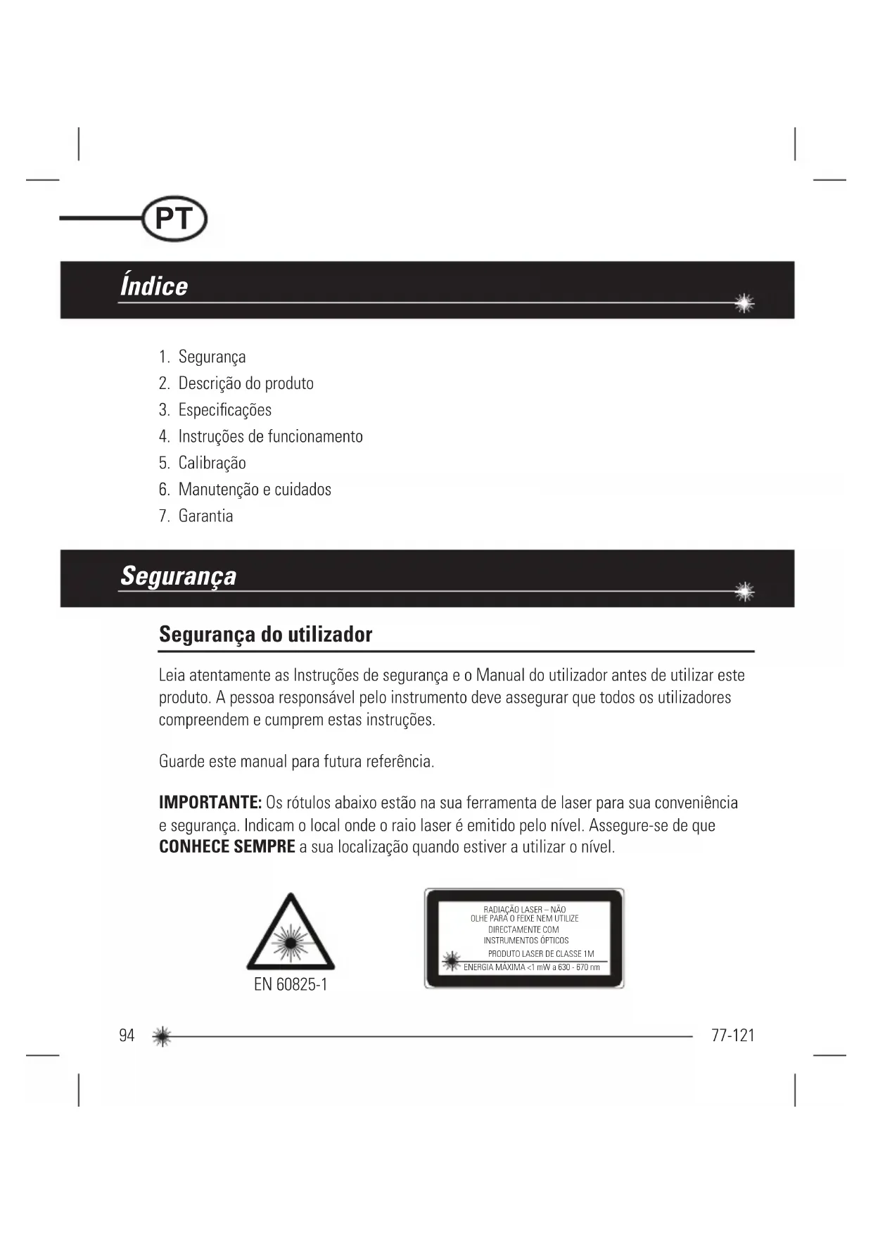 LT LT LT LT TR TR TR HR HR HR HR95 77-121 NÃO remova nenhum rótulo de aviso da estrutura. Este instrumento deve ser utilizado apenas para tarefas de nivelamento e traçados, conforme indicado neste manual. DEVE SEMPRE assegurar-se de que as pessoas presentes nas proximidades estão cientes do perigo de olhar directamente para a ferramenta de laser. NÃO utilize em combinação com outros instrumentos ópticos. Não modifique o instrumento, não faça manipulações nem utilize noutras aplicações para além das descritas no manual. NÃO olhe para o raio com auxiliares ópticos, como lupas, binóculos ou telescópios. NÃO olhe fixamente para o raio laser nem o direccione para outras pessoas. Certifique-se de que o instrumento não está configurado para o nível dos olhos. A protecção dos olhos é normalmente efectuada pelas respostas naturais à aversão, como o reflexo de piscar os olhos. NÃO direccione o raio laser para outras pessoas. DEVE SEMPRE desligar o instrumento de laser quando não estiver em utilização. Deixar o instrumento LIGADO aumenta o risco de alguém inadvertidamente olhar fixamente para o raio laser. NÃO opere o laser em áreas combustíveis, como perto de líquidos inflamáveis, gases ou pó. NÃO desmonte o instrumento de laser. Não há peças no interior que possam ser reparadas pelo utilizador. Desmontar o laser anulará qualquer garantia do produto. Não modifique o produto de forma alguma. Modificar o instrumento de laser pode resultar numa exposição perigosa a radiações. NÃO utilize este instrumento em áreas em que o risco de explosão esteja presente. NOTA: Uma vez que o raio laser é de foco, certifique-se de que verifica o trajecto do raio numa distância relativamente longa e toma todas as precauções necessárias para se certificar de que o raio não interfere com outras pessoas.96 77-121 AVISO: As pilhas podem rebentar ou babar e podem provocar ferimentos ou incêndio. Para reduzir este risco: DEVE SEMPRE seguir todas as instruções e avisos no rótulo e na embalagem das pilhas. NÃO provoque um curto-circuito nos terminais das pilhas NÃOcarregue pilhas alcalinas. NÃO misture pilhas velhas com novas. Troque as pilhas todas na mesma altura por pilhas novas, da mesma marca e tipo. NÃO misture tipos de pilhas. NÃOcoloque as pilhas no fogo. MANTENHAas pilhas fora do alcance das crianças. RETIRE as pilhas se o dispositivo não for utilizado durante vários meses. NOTA: Verifique se foram utilizadas as pilhas correctas, conforme recomendado. NOTA: Verifique se as pilhas foram inseridas da forma correcta, com a polaridade correcta. NÃO elimine este produto com o lixo doméstico. Elimine SEMPRE as pilhas de acordo com as normas locais. RECICLE de acordo com as disposições locais para a recolha e eliminação de resíduos eléctricos e electrónicos, de acordo com a Directiva WEEE. Segurança das pilhas Fim de vida97 77-121