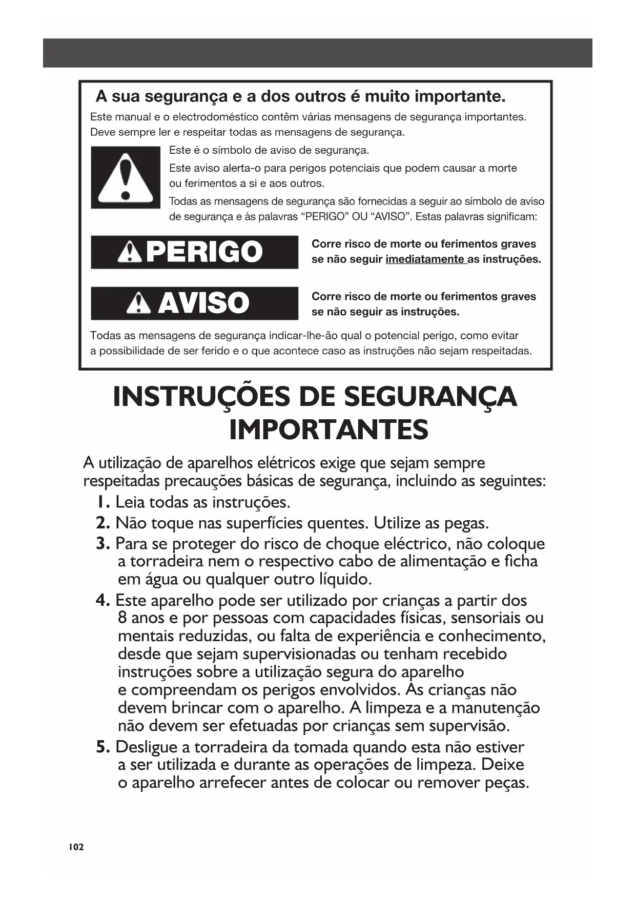 - Serviço de assistência Índice W10506838B_07_PT.indd 101 2/12/14 5:26 PM102 SEGURANÇA DA TORRADEIRASEGURANÇA DA TORRADEIRA A sua segurança e a dos outros é muito importante. Este manual e o electrodoméstico contêm várias mensagens de segurança importantes. Deve sempre ler e respeitar todas as mensagens de segurança. Este é o símbolo de aviso de segurança. Este aviso alerta-o para perigos potenciais que podem causar a morte ou ferimentos a si e aos outros. Todas as mensagens de segurança são fornecidas a seguir ao símbolo de aviso de segurança e às palavras “PERIGO” OU “AVISO”. Estas palavras signicam: Corre risco de morte ou ferimentos graves se não seguir imediatamente as instruções. Corre risco de morte ou ferimentos graves se não seguir as instruções. Todas as mensagens de segurança indicar-lhe-ão qual o potencial perigo, como evitar a possibilidade de ser ferido e o que acontece caso as instruções não sejam respeitadas. PERIGO AVISO A utilização de aparelhos elétricos exige que sejam sempre respeitadas precauções básicas de segurança, incluindo as seguintes: p. 116