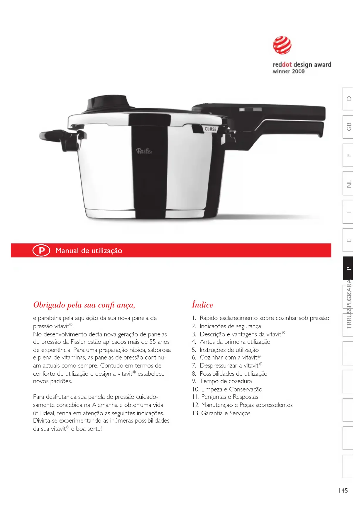 Para desfurar da sua panela de pressao cuidadosamente concebida na Alemanha e obter uma vidautil ideal, tenha em atencao as seguintoas indicaoes.Divirta-se experimentando as inumeras possibilidadesda sua vitavit ^制 e boa parte!