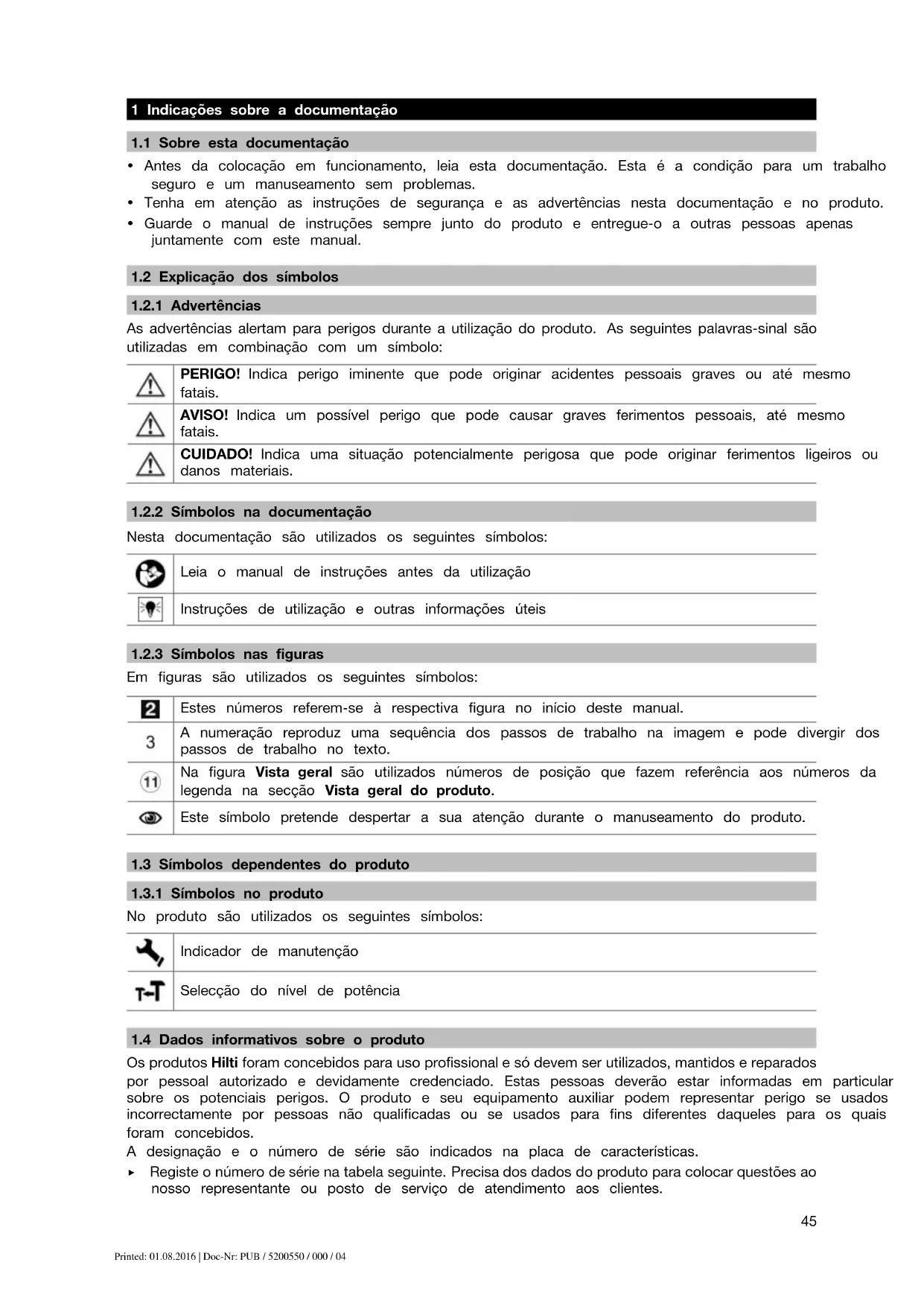Declaramos sob nossa exclusiva responsabilidade que o produto aqui descrito está em conformidade com as directivas e normas em vigor. Na parte final desta documentação encontra uma reprodução da declaração de conformidade. A documentação técnica está depositada junto da: Hilti Entwicklungsgesellschaft mbH | Zulassung Werkzeuge | Hiltistraße 6 | 86916 Kaufering, DE 2 Segurança