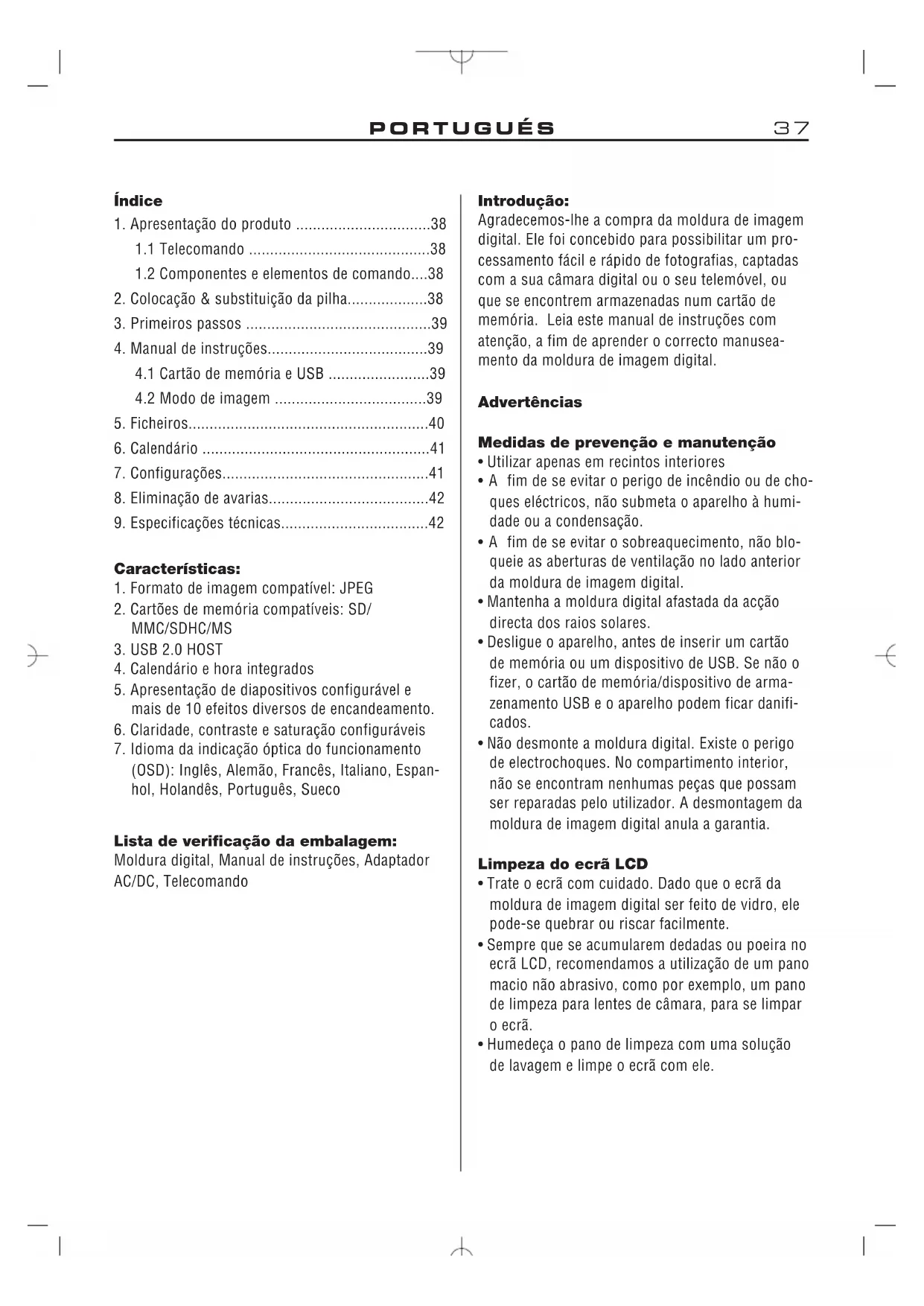(OSD): Inglês, Alemão, Francês, Italiano, Espan- hol, Holandês, Português, Sueco Lista de verificação da embalagem: Moldura digital, Manual de instruções, Adaptador AC/DC, Telecomando Introdução: Agradecemos-lhe a compra da moldura de imagem digital. Ele foi concebido para possibilitar um pro- cessamento fácil e rápido de fotografias, captadas com a sua câmara digital ou o seu telemóvel, ou que se encontrem armazenadas num cartão de memória. Leia este manual de instruções com atenção, a fim de aprender o correcto manusea- mento da moldura de imagem digital. Advertências Medidas de prevenção e manutenção