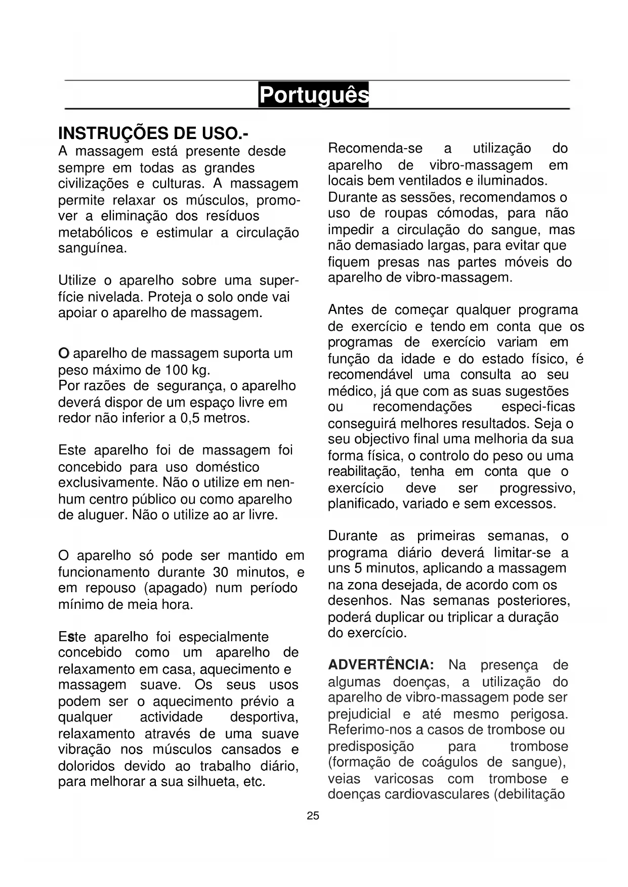 ADVERTÊNCIA: Na presence de algumas doçências, a utilização do aparecido de vibro-massagem pode ser prejudicial e até mesmo perigosa. Referimo-nos a casos de trombose ou predisposition para trombose (formação de coagens de sangue), veias varicosas com trombose e doçências cardiovasculares (debilitação