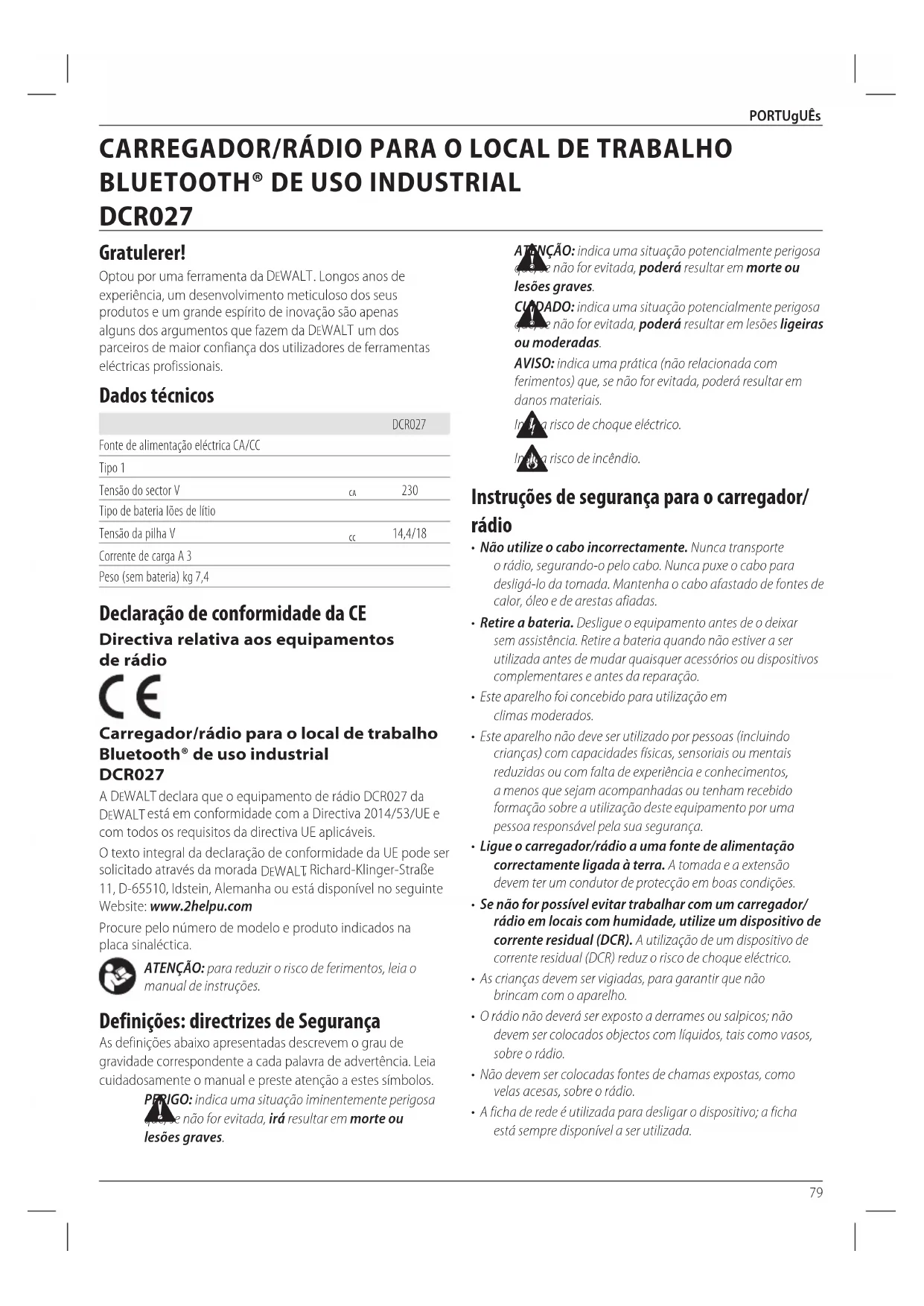 DCR027 Português (traduzido das instruções originais)80 PORTUgUês Segurança eléctrica O rádio/carregador foi concebido apenas para uma voltagemespecífica. Verifique sempre se a voltagem da bateria corresponde à indicada na placa com os requisitos de alimentação. Além disso, certifique-se também de que a voltagem do seu carregador corresponde à da redeeléctrica.