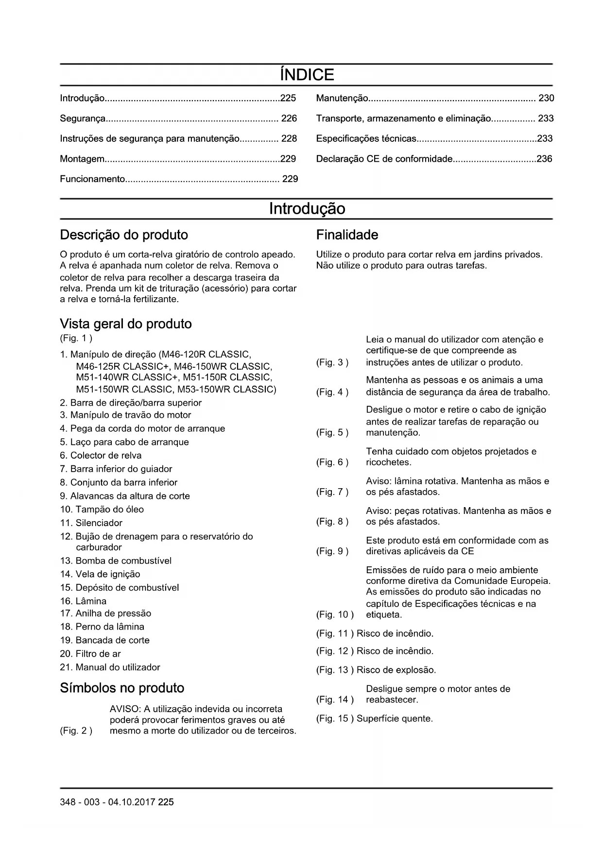 - Declaração CE de conformidade Introdução Descrição do produto O produto é um corta-relva giratório de controlo apeado. A relva é apanhada num coletor de relva. Remova o coletor de relva para recolher a descarga traseira da relva. Prenda um kit de trituração (acessório) para cortar a relva e torná-la fertilizante. Finalidade Utilize o produto para cortar relva em jardins privados. Não utilize o produto para outras tarefas. Vista geral do produto (Fig. 1 ) p. 236