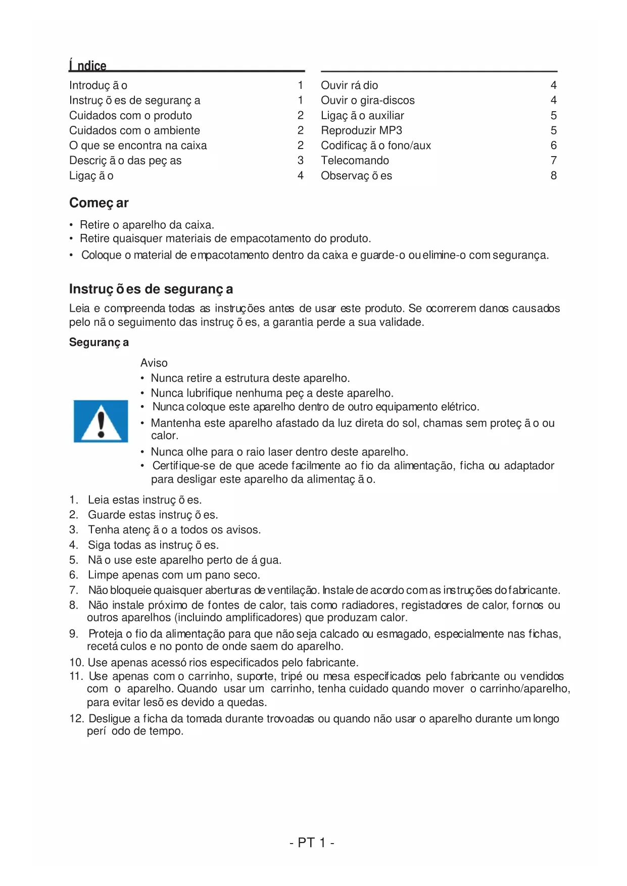 | Instruíções de segurança | 1 | Ouvir o gira-discos | 4 |