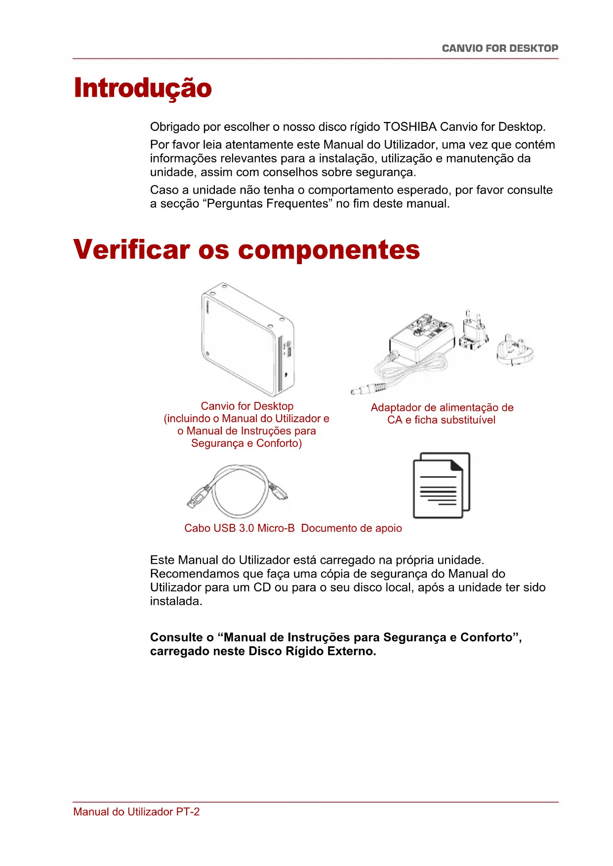 Introdução Obrigado por escolher o nosso disco rígido TOSHIBA Canvio for Desktop. Por favor leia atentamente este Manual do Utilizador, uma vez que contém informações relevantes para a instalação, utilização e manutenção da unidade, assim com conselhos sobre segurança. Caso a unidade não tenha o comportamento esperado, por favor consulte a secção “Perguntas Frequentes” no fim deste manual. Verificar os componentes Este Manual do Utilizador está carregado na própria unidade. Recomendamos que faça uma cópia de segurança do Manual do Utilizador para um CD ou para o seu disco local, após a unidade ter sido instalada. Consulte o “Manual de Instruções para Segurança e Conforto”, carregado neste Disco Rígido Externo. Canvio for Desktop (incluindo o Manual do Utilizador e o Manual de Instruções para Segurança e Conforto) Adaptador de alimentação de CA e ficha substituível Cabo USB 3.0 Micro-B Documento de apoioManual do Utilizador PT-3