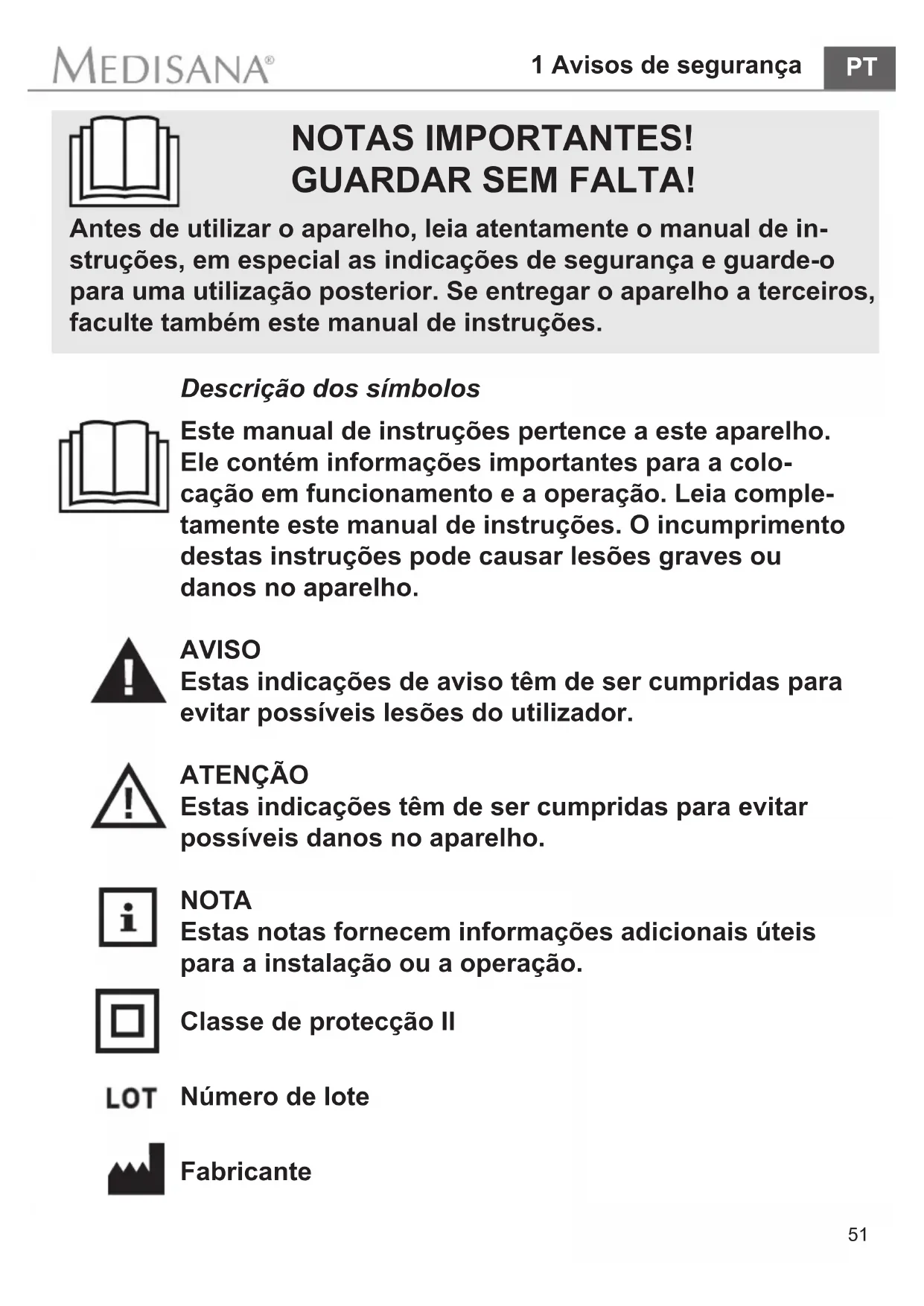 Classe de protecção II Número de lote Fabricante 1 Avisos de segurança NOTAS IMPORTANTES! GUARDAR SEM FALTA! Antes de utilizar o aparelho, leia atentamente o manual de in- struções, em especial as indicações de segurança e guarde-o para uma utilização posterior. Se entregar o aparelho a terceiros, faculte também este manual de instruções. Descrição dos símbolos Este manual de instruções pertence a este aparelho. Ele contém informações importantes para a colo- cação em funcionamento e a operação. Leia comple- tamente este manual de instruções. O incumprimento destas instruções pode causar lesões graves ou danos no aparelho. AVISO Estas indicações de aviso têm de ser cumpridas para evitar possíveis lesões do utilizador. ATENÇÃO Estas indicações têm de ser cumpridas para evitar possíveis danos no aparelho. NOTA Estas notas fornecem informações adicionais úteis para a instalação ou a operação.52 1 Avisos de segurança