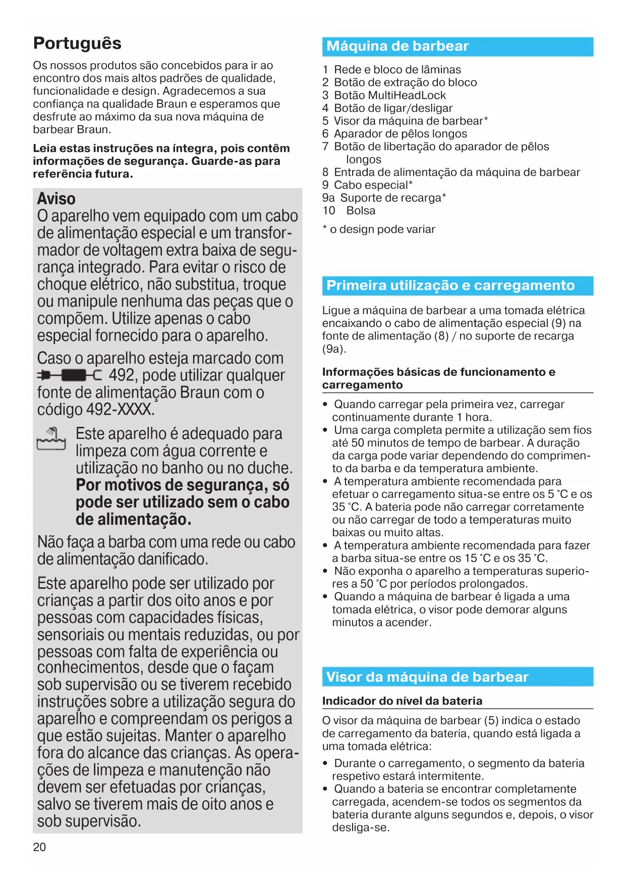 La afeitadora se apaga con la batería totalmente cargada. La lámina y el bloque de cuchillas están desgastados, lo que exige más potencia que la que el motor puede ofrecer. La afeitadora se apaga. – Sustituya la lámina y el bloque de cuchillas. – Lubrique con regularidad el sistema de afeitado, especialmente cuando solo utilice agua en la limpieza. 91154595_Series_9-2_Solo_Euro_S6-96.indd 19 28.11.16 13:0920 Português Os nossos produtos são concebidos para ir ao encontro dos mais altos padrões de qualidade, funcionalidade e design. Agradecemos a sua confiança na qualidade Braun e esperamos que desfrute ao máximo da sua nova máquina de barbear Braun. Leia estas instruções na íntegra, pois contêm informações de segurança. Guarde-as para referência futura. Aviso O aparelho vem equipado com um cabo de alimentação especial e um transfor- mador de voltagem extra baixa de segu- rança integrado. Para evitar o risco de choque elétrico, não substitua, troque ou manipule nenhuma das peças que o compõem. Utilize apenas o cabo especial fornecido para o aparelho. Caso o aparelho esteja marcado com 492, pode utilizar qualquer fonte de alimentação Braun com o código 492-XXXX. Este aparelho é adequado para limpeza com água corrente e utilização no banho ou no duche. Por motivos de segurança, só pode ser utilizado sem o cabo de alimentação. Não faça a barba com uma rede ou cabo de alimentação danificado. Este aparelho pode ser utilizado por crianças a partir dos oito anos e por pessoas com capacidades físicas, sensoriais ou mentais reduzidas, ou por pessoas com falta de experiência ou conhecimentos, desde que o façam sob supervisão ou se tiverem recebido instruções sobre a utilização segura do aparelho e compreendam os perigos a que estão sujeitas. Manter o aparelho fora do alcance das crianças. As opera- ções de limpeza e manutenção não devem ser efetuadas por crianças, salvo se tiverem mais de oito anos e sob supervisão. Máquina de barbear 1 Rede e bloco de lâminas 2 Botão de extração do bloco 3 Botão MultiHeadLock 4 Botão de ligar/desligar 5 Visor da máquina de barbear* 6 Aparador de pêlos longos 7 Botão de libertação do aparador de pêlos longos 8 Entrada de alimentação da máquina de barbear 9 Cabo especial* 9a Suporte de recarga* 10 Bolsa