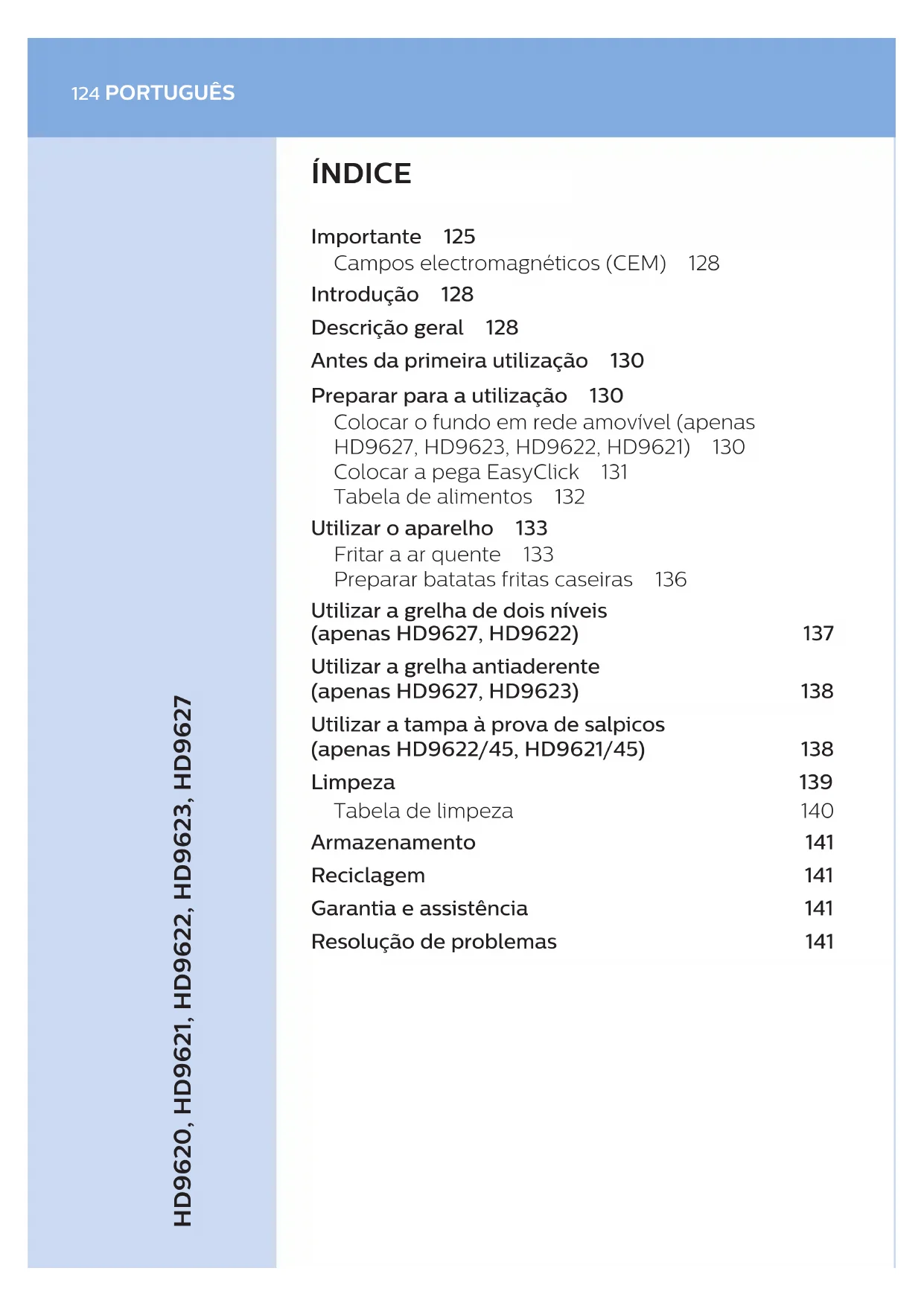 - A grelha de dois níveis aquece muito durante a utilização. Utilize luvas para forno quando remover a grelha de dois níveis do cesto.138 PORTUGUÊS Utilizar a grelha antiaderente (apenas HD9627, HD9623) 1 Siga os passos 1 a 3 da secção "Fritar a ar quente". 2 Prima o botão de libertação do cesto e levante o cesto para fora do recipiente. 3 Encaixe a pega EasyClick na grelha antiaderente (consulte "Colocar a pega EasyClick"). 4 Coloque a grelha antiaderente no recipiente. 5 Coloque os ingredientes na grelha antiaderente. 6 Siga os passos 6 a 12 da secção "Fritar a ar quente". Utilizar a tampa à prova de salpicos (apenas HD9622/45, HD9621/45) Utilize a tampa à prova de salpicos se estiver a preparar ingredientes leves para os manter dentro do cesto, para ingredientes com gordura ou para reduzir a velocidade a que os ingredientes tostam. Nota
