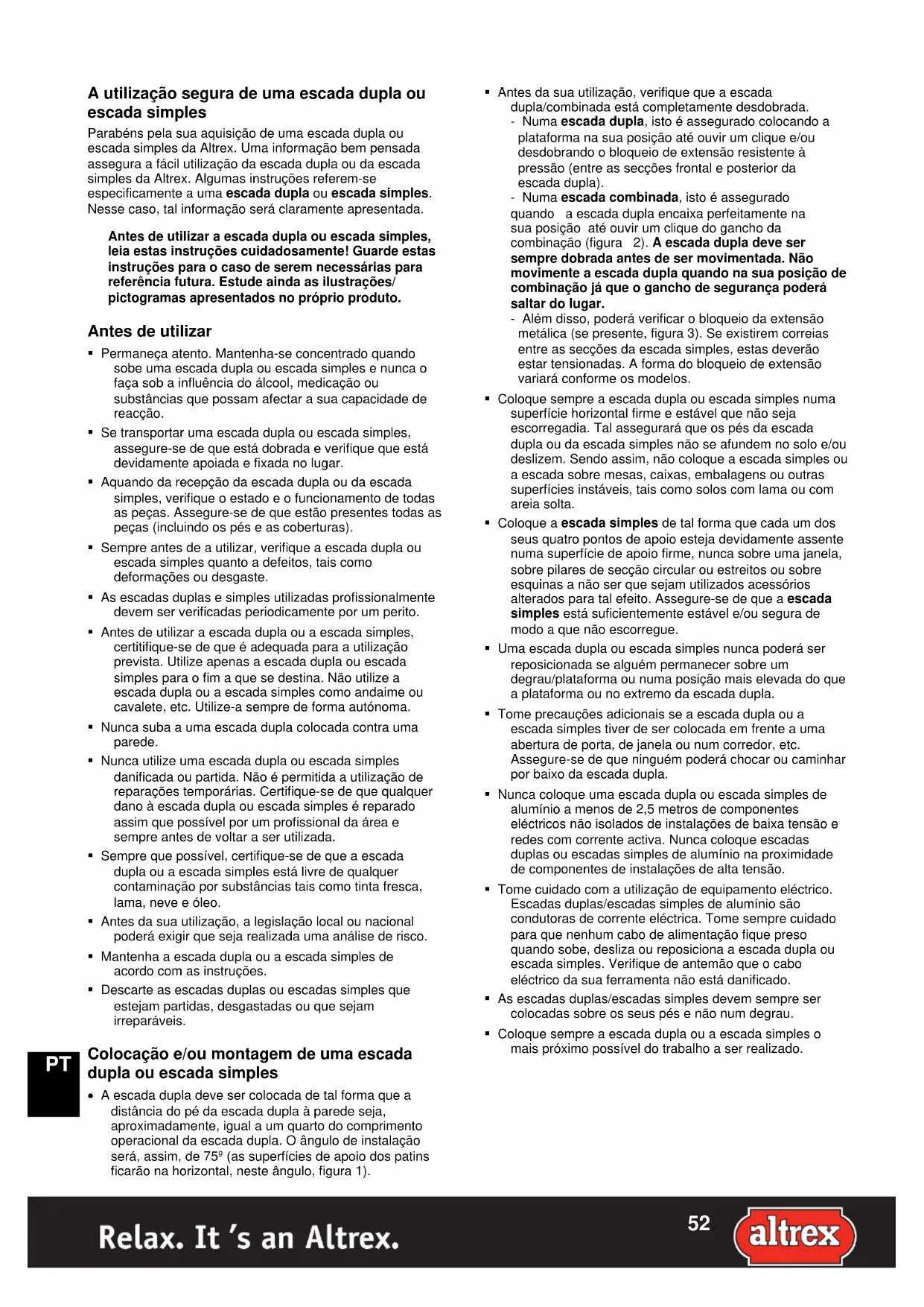 A utilização segura de uma escada dupla ou escada simples Parabéns pela sua aquisição de uma escada dupla ou escada simples da Altrex. Uma informação bem pensada assegura a fácil utilização da escada dupla ou da escada simples da Altrex. Algumas instruções referem-se especificamente a uma escada dupla ou escada simples. Nesse caso, tal informação será claramente apresentada. Antes de utilizar a escada dupla ou escada simples, leia estas instruções cuidadosamente! Guarde estas instruções para o caso de serem necessárias para referência futura. Estude ainda as ilustrações/ pictogramas apresentados no próprio produto. Antes de utilizar Permaneça atento. Mantenha-se concentrado quando sobe uma escada dupla ou escada simples e nunca o faça sob a influência do álcool, medicação ou substâncias que possam afectar a sua capacidade de reacção. Se transportar uma escada dupla ou escada simples, assegure-se de que está dobrada e verifique que está devidamente apoiada e fixada no lugar. Aquando da recepção da escada dupla ou da escada simples, verifique o estado e o funcionamento de todas as peças. Assegure-se de que estão presentes todas as peças (incluindo os pés e as coberturas). Sempre antes de a utilizar, verifique a escada dupla ou escada simples quanto a defeitos, tais como deformações ou desgaste. As escadas duplas e simples utilizadas profissionalmente devem ser verificadas periodicamente por um perito. Antes de utilizar a escada dupla ou a escada simples, certitifique-se de que é adequada para a utilização prevista. Utilize apenas a escada dupla ou escada simples para o fim a que se destina. Não utilize a escada dupla ou a escada simples como andaime ou cavalete, etc. Utilize-a sempre de forma autónoma. Nunca suba a uma escada dupla colocada contra uma parede. Nunca utilize uma escada dupla ou escada simples danificada ou partida. Não é permitida a utilização de reparações temporárias. Certifique-se de que qualquer dano à escada dupla ou escada simples é reparado assim que possível por um profissional da área e sempre antes de voltar a ser utilizada. Sempre que possível, certifique-se de que a escada dupla ou a escada simples está livre de qualquer contaminação por substâncias tais como tinta fresca, lama, neve e óleo. Antes da sua utilização, a legislação local ou nacional poderá exigir que seja realizada uma análise de risco. Mantenha a escada dupla ou a escada simples de acordo com as instruções. Descarte as escadas duplas ou escadas simples que estejam partidas, desgastadas ou que sejam irreparáveis. Colocação e/ou montagem de uma escada dupla ou escada simples A escada dupla deve ser colocada de tal forma que a distância do pé da escada dupla à parede seja, aproximadamente, igual a um quarto do comprimento operacional da escada dupla. O ângulo de instalação será, assim, de 75º (as superfícies de apoio dos patins ficarão na horizontal, neste ângulo, figura 1).
