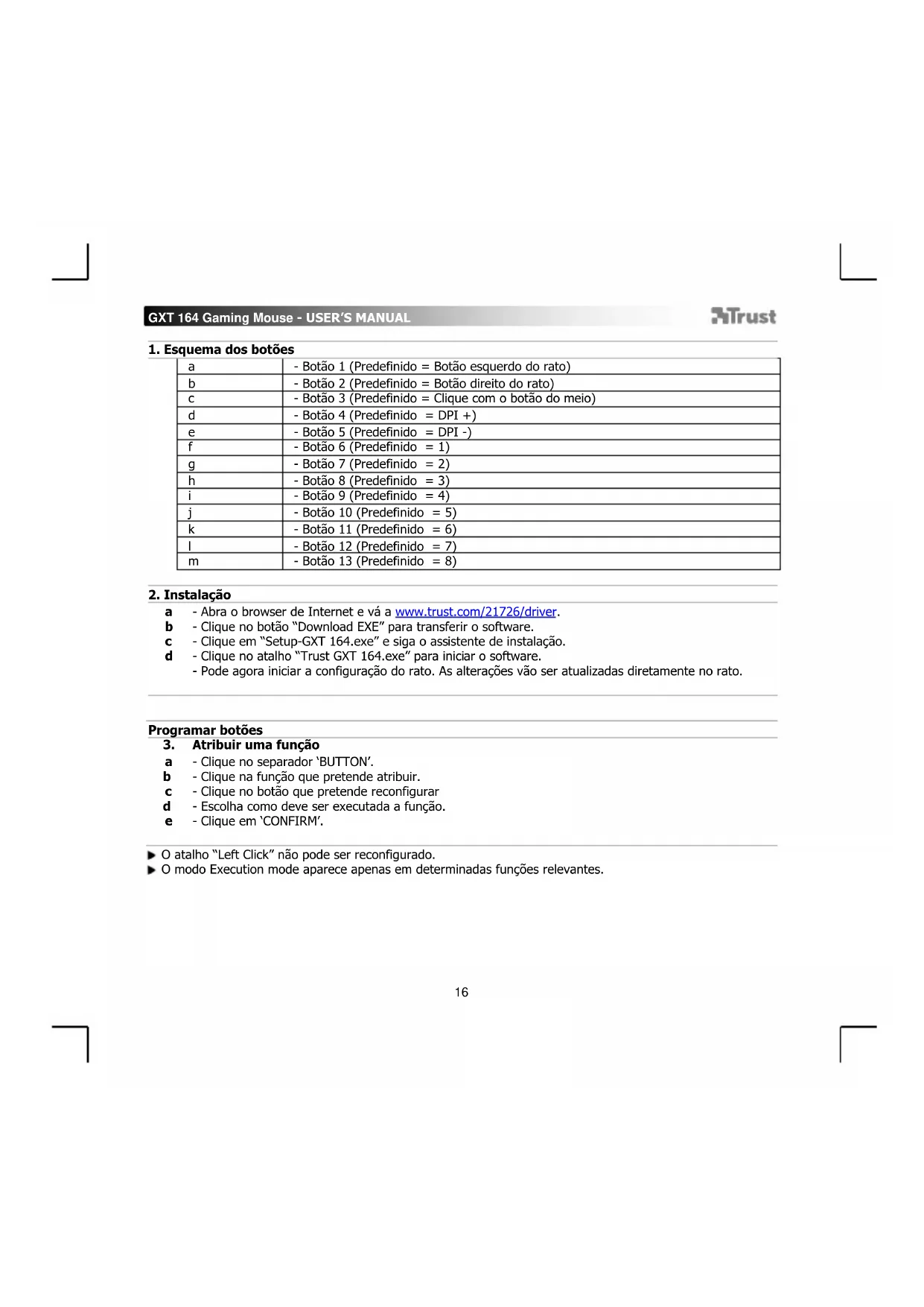 - Abra o browser de Internet e vá a www.trust.com/21726/driver. - Clique no botão “Download EXE” para transferir o software. - Clique em “Setup-GXT 164.exe” e siga o assistente de instalação. - Clique no atalho “Trust GXT 164.exe” para iniciar o software. - Pode agora iniciar a configuração do rato. As alterações vão ser atualizadas diretamente no rato.