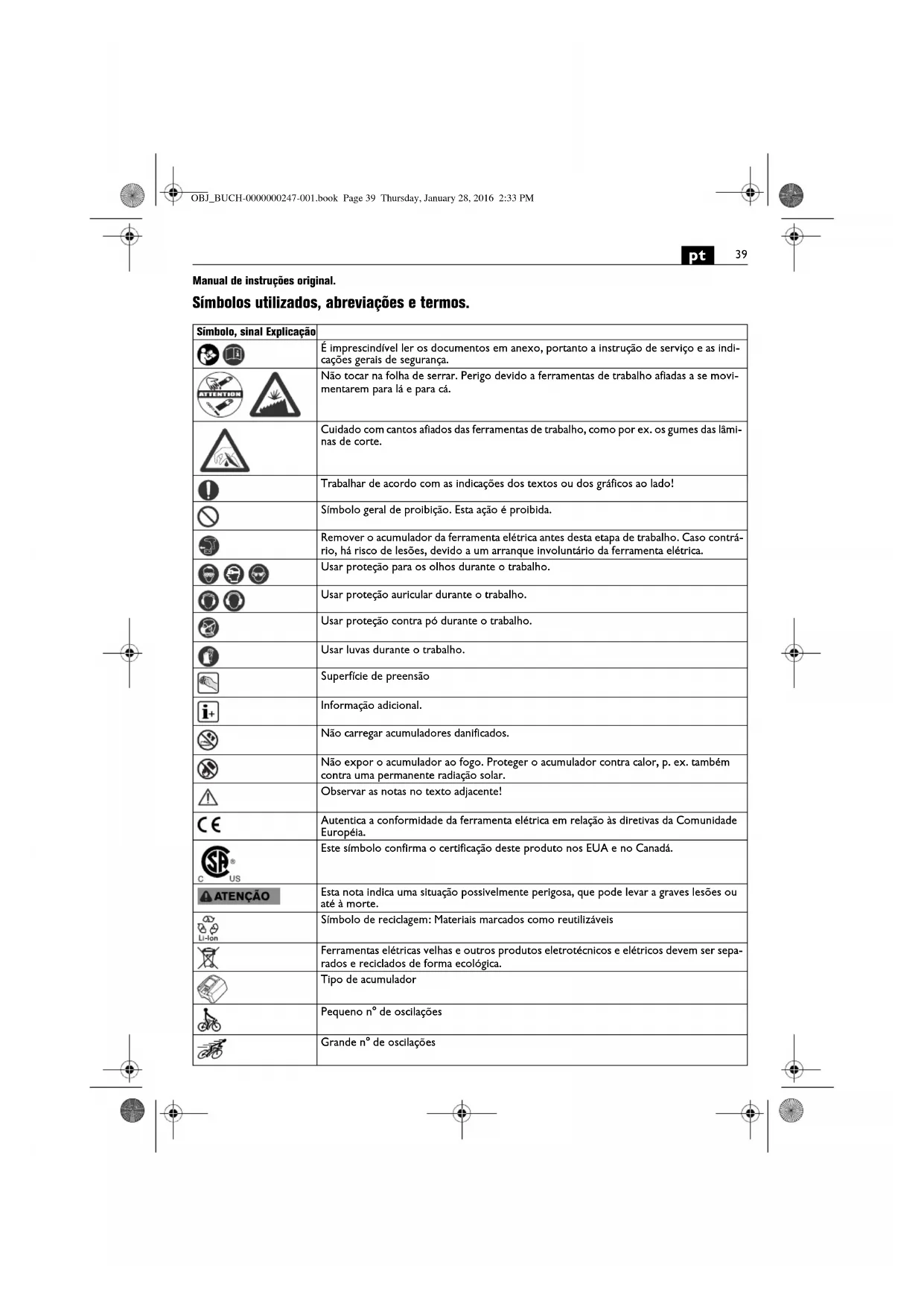 Manual de instruções original. Símbolos utilizados, abreviações e termos. Símbolo, sinal Explicação É imprescindível ler os documentos em anexo, portanto a instrução de serviço e as indi- cações gerais de segurança. Não tocar na folha de serrar. Perigo devido a ferramentas de trabalho afiadas a se movi- mentarem para lá e para cá. Cuidado com cantos afiados das ferramentas de trabalho, como por ex. os gumes das lâmi- nas de corte. Trabalhar de acordo com as indicações dos textos ou dos gráficos ao lado! Símbolo geral de proibição. Esta ação é proibida. Remover o acumulador da ferramenta elétrica antes desta etapa de trabalho. Caso contrá- rio, há risco de lesões, devido a um arranque involuntário da ferramenta elétrica. Usar proteção para os olhos durante o trabalho. Usar proteção auricular durante o trabalho. Usar proteção contra pó durante o trabalho. Usar luvas durante o trabalho. Superfície de preensão Informação adicional. Não carregar acumuladores danificados. Não expor o acumulador ao fogo. Proteger o acumulador contra calor, p. ex. também contra uma permanente radiação solar. Observar as notas no texto adjacente! Autentica a conformidade da ferramenta elétrica em relação às diretivas da Comunidade Européia. Este símbolo confirma o certificação deste produto nos EUA e no Canadá. Esta nota indica uma situação possivelmente perigosa, que pode levar a graves lesões ou até à morte. Símbolo de reciclagem: Materiais marcados como reutilizáveis Ferramentas elétricas velhas e outros produtos eletrotécnicos e elétricos devem ser sepa- rados e reciclados de forma ecológica. Tipo de acumulador Pequeno n° de oscilações Grande n° de oscilações OBJ_BUCH-0000000247-001.book Page 39 Thursday, January 28, 2016 2:33 PM40