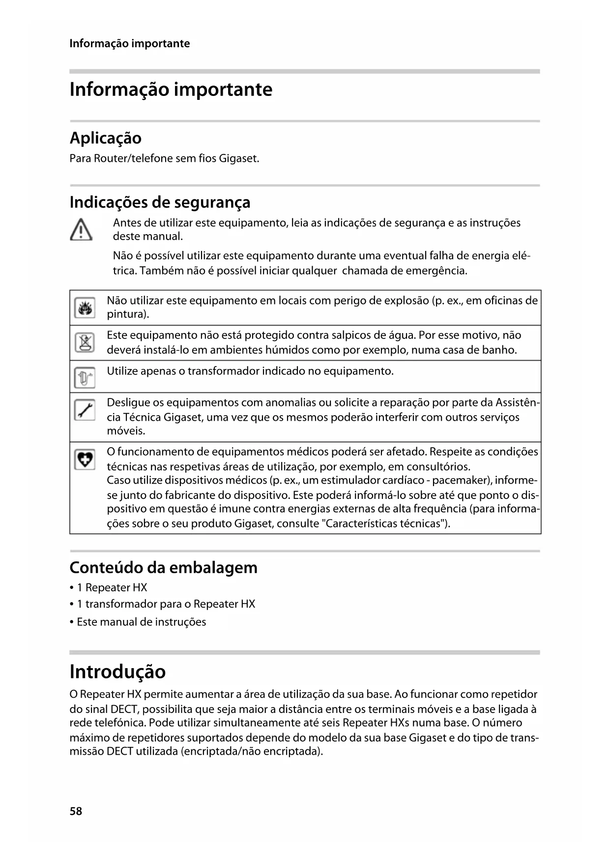 - Este manual de instruções Introdução O Repeater HX permite aumentar a área de utilização da sua base. Ao funcionar como repetidor do sinal DECT, possibilita que seja maior a distância entre os terminais móveis e a base ligada à rede telefónica. Pode utilizar simultaneamente até seis Repeater HXs numa base. O número máximo de repetidores suportados depende do modelo da sua base Gigaset e do tipo de trans- missão DECT utilizada (encriptada/não encriptada). Antes de utilizar este equipamento, leia as indicações de segurança e as instruções deste manual. Não é possível utilizar este equipamento durante uma eventual falha de energia elé- trica. Também não é possível iniciar qualquer chamada de emergência. Não utilizar este equipamento em locais com perigo de explosão (p. ex., em oficinas de pintura). Este equipamento não está protegido contra salpicos de água. Por esse motivo, não deverá instalá-lo em ambientes húmidos como por exemplo, numa casa de banho. Utilize apenas o transformador indicado no equipamento. Desligue os equipamentos com anomalias ou solicite a reparação por parte da Assistên- cia Técnica Gigaset, uma vez que os mesmos poderão interferir com outros serviços móveis. O funcionamento de equipamentos médicos poderá ser afetado. Respeite as condições técnicas nas respetivas áreas de utilização, por exemplo, em consultórios. Caso utilize dispositivos médicos (p. ex., um estimulador cardíaco - pacemaker), informe- se junto do fabricante do dispositivo. Este poderá informá-lo sobre até que ponto o dis- positivo em questão é imune contra energias externas de alta frequência (para informa- ções sobre o seu produto Gigaset, consulte "Características técnicas").59 Repeater HX / ALL IM pt / A31008-N603-R101-1-SU19 / Grep-port_HX.fm / 3/28/19 Template Go, Version 1, 01.07.2014 / ModuleVersion 1.0 Introdução PORTUGUÊS Dentro da área de cobertura alargada de um Repeater HX podem ser efetuadas no máximo 2 chamadas em simultâneo. O número máximo de terminais móveis registados na sua base não é influenciado pelo Repeater HX. Funçãos do Repeater HX: