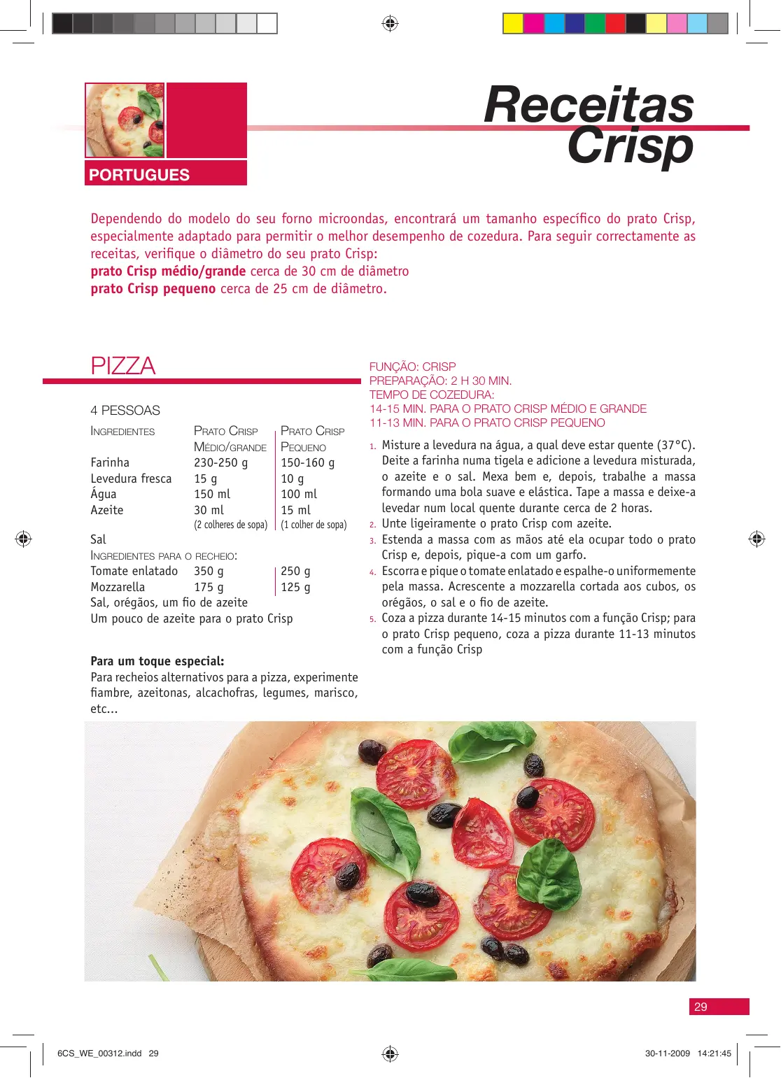 PORTUGUES Dependendo do modelo do seu forno microondas, encontrará um tamanho específico do prato Crisp, especialmente adaptado para permitir o melhor desempenho de cozedura. Para seguir correctamente as receitas, verifique o diâmetro do seu prato Crisp: prato Crisp médio/grande cerca de 30 cm de diâmetro prato Crisp pequeno cerca de 25 cm de diâmetro.