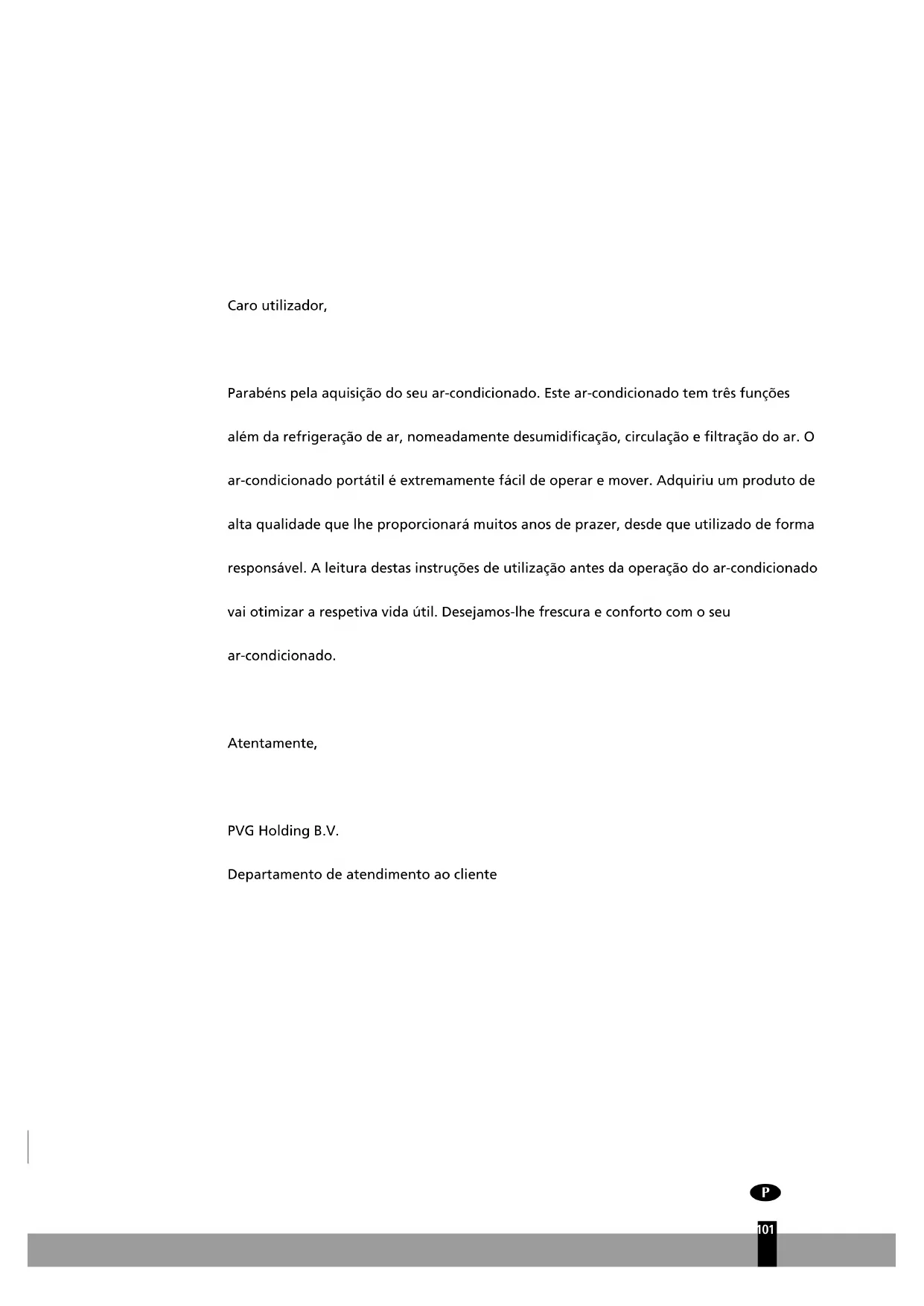 Caro utilizador, Parabéns pela aquisição do seu ar-condicionado. Este ar-condicionado tem três funções além da refrigeração de ar, nomeadamente desumidificação, circulação e filtração do ar. O ar-condicionado portátil é extremamente fácil de operar e mover. Adquiriu um produto de alta qualidade que lhe proporcionará muitos anos de prazer, desde que utilizado de forma responsável. A leitura destas instruções de utilização antes da operação do ar-condicionado vai otimizar a respetiva vida útil. Desejamos-lhe frescura e conforto com o seu ar-condicionado. Atentamente, PVG Holding B.V. Departamento de atendimento ao cliente