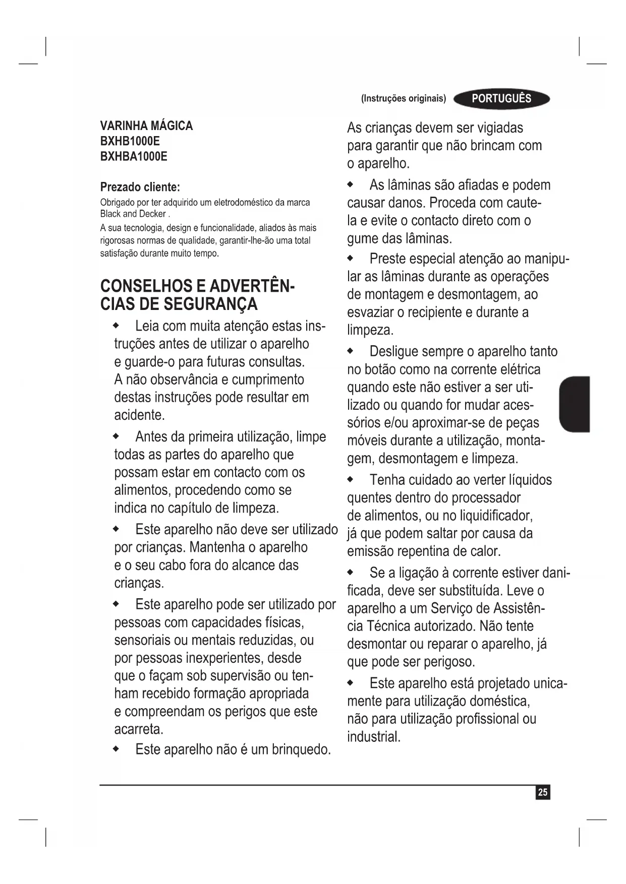 BXHB1000E BXHBA1000E Prezado cliente: Obrigado por ter adquirido um eletrodoméstico da marca Black and Decker . A sua tecnologia, design e funcionalidade, aliados às mais rigorosas normas de qualidade, garantir-lhe-ão uma total satisfação durante muito tempo.