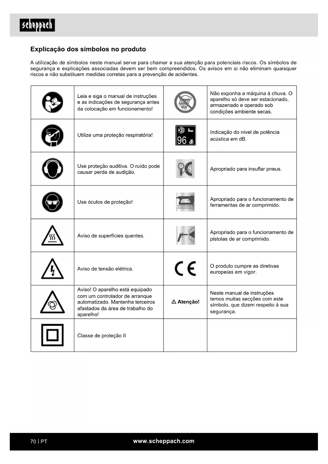 Indicação do nível de potência acústica em dB. Use proteção auditiva. O ruído pode causar perda de audição. Apropriado para insuar pneus. Use óculos de proteção! Apropriado para o funcionamento de ferramentas de ar comprimido. Aviso de superfícies quentes. Apropriado para o funcionamento de pistolas de ar comprimido. Aviso de tensão elétrica. O produto cumpre as diretivas europeias em vigor. Aviso! O aparelho está equipado com um controlador de arranque automatizado. Mantenha terceiros afastados da área de trabalho do aparelho! m Atenção! Neste manual de instruções temos muitas secções com este símbolo, que dizem respeito à sua segurança. Classe de proteção IIwww.scheppach.com