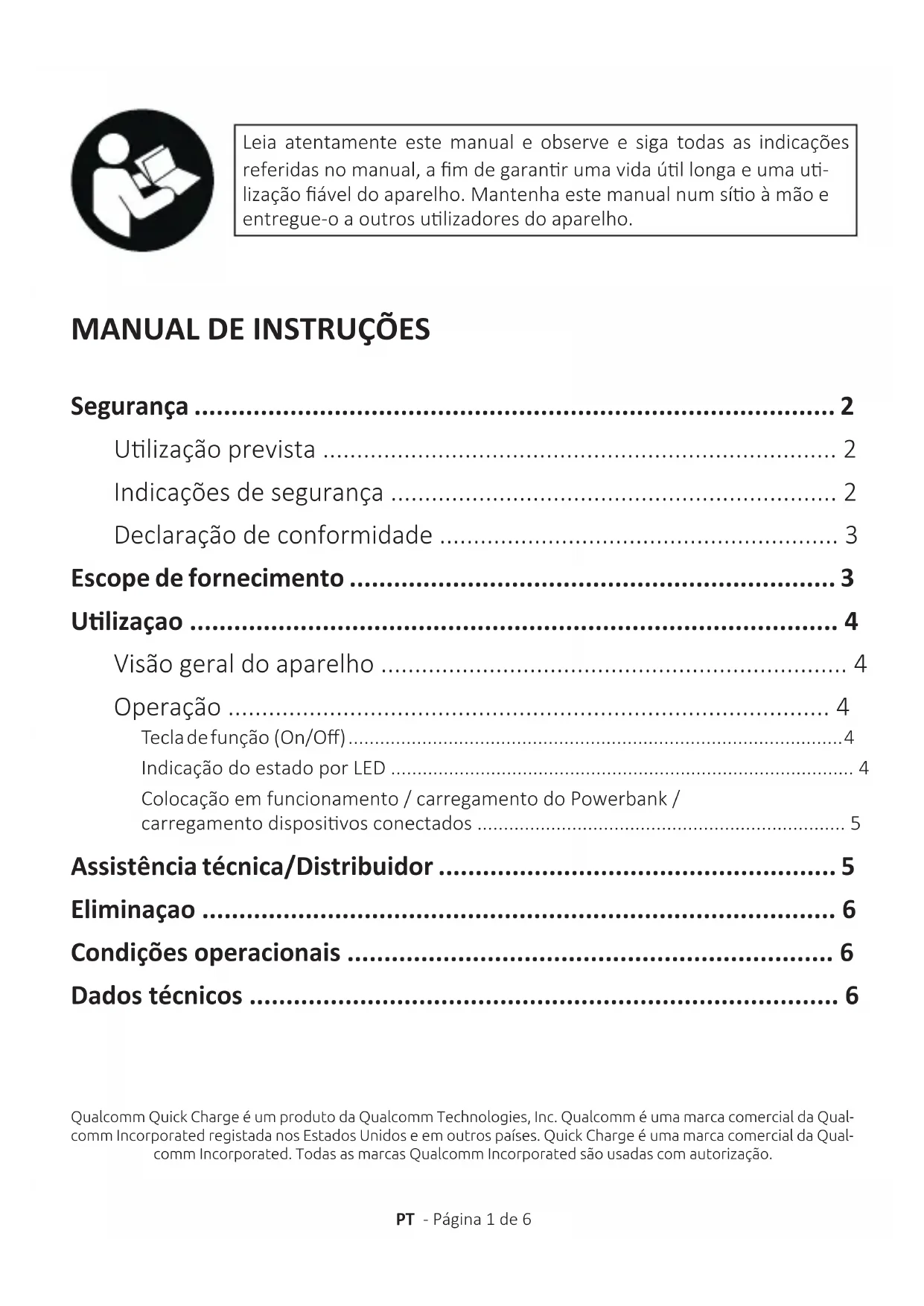 - Dados técnicos PT - Página 1 de 6 Qualcomm Quick Charge é um produto da Qualcomm Technologies, Inc. Qualcomm é uma marca comercial da Qual- comm Incorporated registada nos Estados Unidos e em outros países. Quick Charge é uma marca comercial da Qual- comm Incorporated. Todas as marcas Qualcomm Incorporated são usadas com autorização.SEGURANÇA Ulização prevista Este Powerbank está indicado exclusivamente para a alimentação de energia de disposivos com uma tensão de serviço de 5V (telemóveis, leitores de MP3, etc.), e para disposivos que suportem a norma Power Delivery (PD) ou norma de tecnologia da Qualcomm® Quick Charge™. Este produto não está previsto para uma ulização comercial ou para aplicações médicas ou especiais, nas quais a falha do produto possa provocar ferimentos, morte ou danos materiais avultados. A responsabilidade exngue-se no caso de uma ulização que não corresponda à ulização prevista. A abertura e a remodelação do aparelho e a ulização de disposivos auxiliares e acessórios, que não sejam autorizados por nós, não são permidas. Não use o aparelho com condições ambientais extremas e observe as instruções de segurança. Uma in- observância das informações e indicações de segurança neste manual é considerada como desrespeito da ulização prevista e provoca a exnção da responsabilidade e pode causar ferimentos ou danos materiais. Podem ser efetuadas alterações sem aviso prévio no rmware e/ou hardware. Por esse movo, é possível que partes deste manual, dados técnicos e imagens nesta documentação possam divergir do seu produto. Todos os pontos descritos neste manual desnam-se apenas ao esclarecimento e não têm forçosamente de coincidir com uma situação especíca. Não podem ser exercidos direitos legais em virtude deste manual. Indicações de segurança Perigos para crianças e pessoas com capacidades sicas, sensoriais ou intelectuais limit- adas: As crianças subesmam muitas vezes o perigo ou não o conseguem mesmo idencar. Este aparelho não deve ser ulizado por pessoas (incluindo crianças) com capacidades sensoriais, sicas ou intelectuais limit- adas ou sem experiência e/ou conhecimento, a não ser sob a vigilância de uma pessoa responsável pela sua segurança ou que estejam a receber instruções sobre a ulização do aparelho e tenham percebido os perigos daí resultantes. Crianças sem supervisão não devem ter acesso ao aparelho. Cerque-se de que as crianças não brincam com o aparelho. Perigo de asxia! As crianças podem pôr na boca a película de embalagem ou peças pequenas e ser asxiadas. Perigo de curto-circuito! Para evitar ferimentos, não use este aparelho com as mãos molhadas. Não insira objetos, que não estejam previstos para a ulização, nas aberturas do aparelho. Isto pode provo- car um choque elétrico e, consequentemente, um incêndio. Nunca use o aparelho se houver danos visíveis no próprio aparelho ou no cabo USB, uma vez que isso pode provocar ferimentos ou danicações. O aparelho não pode ser sujeito a salpicos nem gotas de água. Recipientes cheios com líquido (vasos, copos ou similares) não podem ser colocados sobre o aparelho ou nas suas proximidades. Existe o perigo de o aparelho tombar e o líquido prejudicar a segurança elétrica. Perigo de tropeçar! Ao posicionar o aparelho, preste atenção para que ninguém possa tropeçar no cabo e cair. Não coloque objetos por cima do cabo. PT - Página 2 de 6Danicação! Não ulize o aparelho em zonas muito frias, muito quentes ou com muito pó. Também não sujeite o aparel- ho a luz solar direta. Proteja o produto de fogo aberto. Existe perigo de explosão! Proteja o aparelho de impactos e quedas em qualquer estado de funcionamento. Este aparelho é sensível a descargas eletrostácas. Por isso, proteja o aparelho de qualquer possibilidade de descarga eletrostáca. Para evitar anomalias, não conecte as ligações de saída USB do aparelho a portas USB de computadores ou de outros disposivos. Essa ligação está apenas indicada para o carregamento de disposivos. Para evitar um sobreaquecimento, não bloqueie nem tape as aberturas do produto. Não cubra completamente o produto durante o funcionamento para garanr uma dissipação térmica. Não abra a caixa do aparelho nem desmonte o aparelho nos seus componentes. Não tente reparar o apa- relho por conta própria. Nesse caso, a garana será anulada. ATENÇÃO! Supercie muito quente! Ao segurar durante mais tempo durante a ulização podem ser causa- dos ferimentos da pele provocados por calor. Evite segurar permanentemente du- rante a ulização, especialmente nas partes que desenvolvem um calor mais forte. Não use o aparelho diretamente junto ao corpo durante a ulização. Depois de arrefecido, o aparelho pode ser tocado connuamente. Declaração de conformidade A marcação CE signica que este produto cumpre os requisitos de todas as direvas UE em vigor para este produto. p. 6