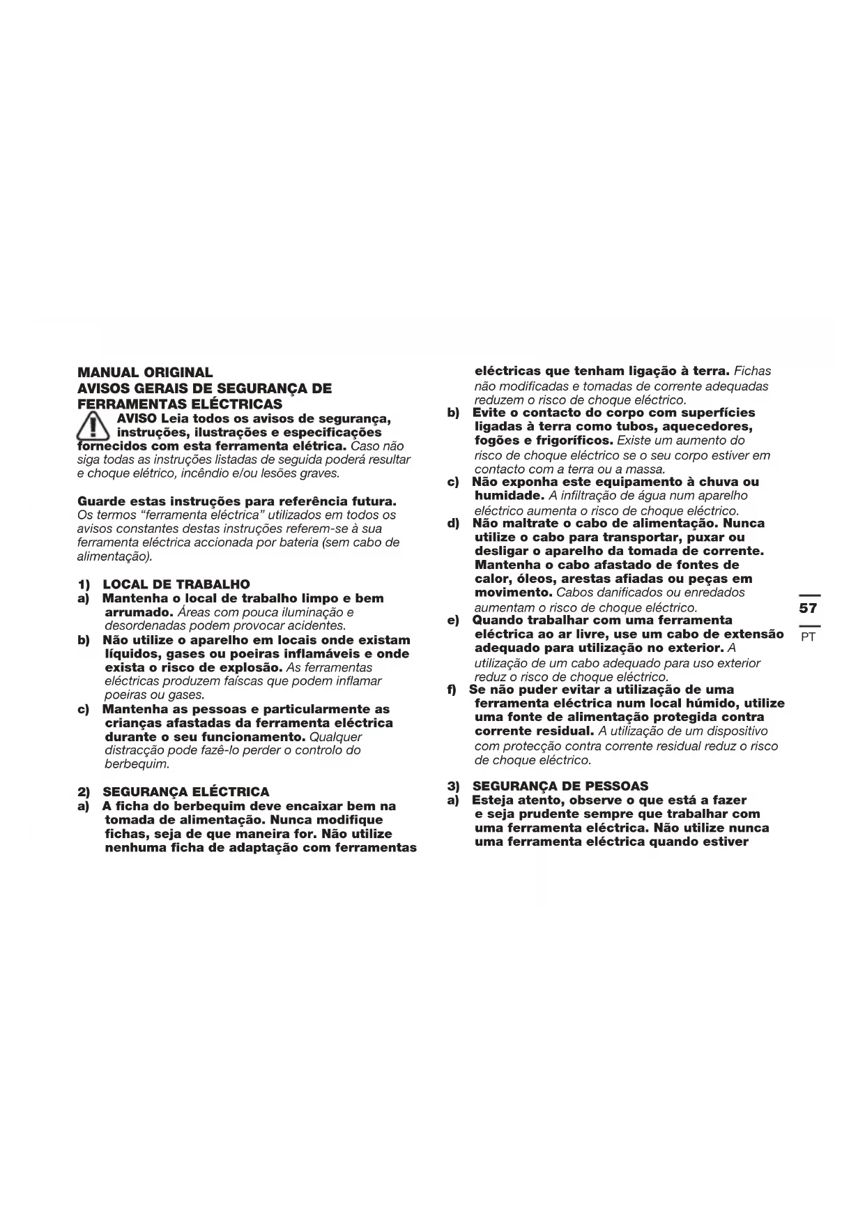 a) Não force a ferramenta. Utilize a ferramenta eléctrica apropriada para cada aplicação. A utilização da ferramenta eléctrica apropriada executa o trabalho de forma melhor e mais segura, à velocidade para a qual foi concebida. b) Não utilize esta ferramenta se o interruptor estiver deficiente, não ligando ou desligando. Qualquer ferramenta eléctrica que não possa ser controlada pelo interruptor é perigosa e deve ser reparada. c) Desligue a ficha da tomada elétrica e/ ou remova o conjunto de pilhas, caso seja possível removê-lo, da ferramenta elétrica antes de realizar quaisquer ajustes, substituir acessórios ou armazenar ferramentas elétricas. Estas medidas de segurança preventivas reduzem o risco de activação acidental da ferramenta. d) Quando não estiver a usar a ferramenta eléctrica, guarde-a fora do alcance das crianças e não deixe que esta seja utilizada por pessoas que não a conheçam, nem tenham lido as instruções. As ferramentas eléctricas são perigosas nas mãos de utilizadores inexperientes.59