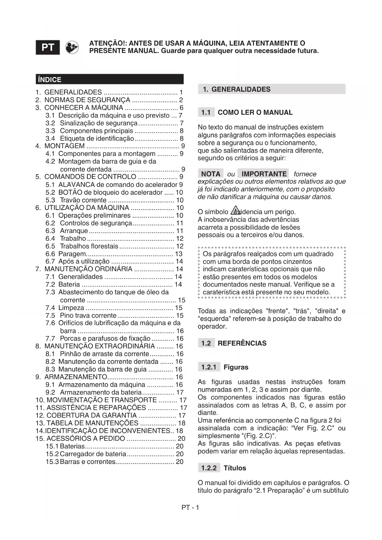 Na "Tabela para a combinação correta entre barra e corrente", foram relacionadas todas as combinações possíveis entre barra e corrente. A mesma tabela também fornece os dados característicos das correntes e das barras homologadas para cada máquina. Para as peças sobressalentes, use somente barras e correntes indicadas na tabela. O uso de combinações não aprovadas pode causar sérios ferimentos pessoais e danicar a máquina. Visto que a escolha, a aplicação e a utilização da barra e da corrente são atos praticados pelo utilizador na sua total autonomia, ele assumirá a responsabilidade em caso de danos de qualquer natureza decorrentes de tais atos. Em caso de dúvidas ou de falta de conhecimento da especicidade de cada barra ou corrente, é necessário contatar o revendedor ou um centro de jardinagem especializado.RO - 1 ATENŢIE!: ÎNAINTE DE A UTILIZA MAȘINA, CITIŢI CU ATENŢIE ACEST MANUAL. A se păstra pentru consultări ulterioare.