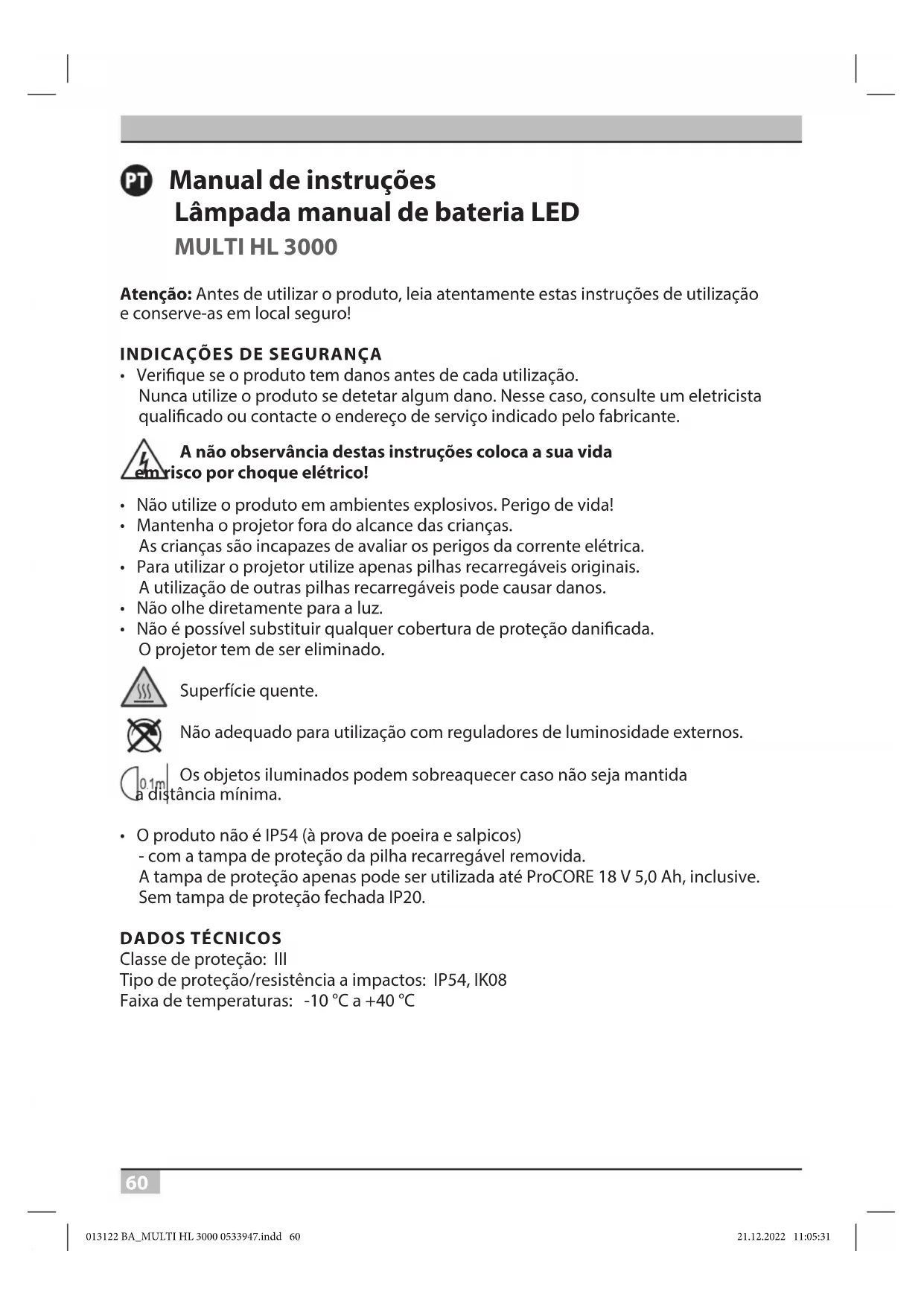 Classe de proteção: III Tipo de proteção/resistência a impactos: IP54, IK08 Faixa de temperaturas: -10 °C a +40 °C 013122 BA_MULTI HL 3000 0533947.indd 60013122 BA_MULTI HL 3000 0533947.indd 60 21.12.2022 11:05:3121.12.2022 11:05:3161 MULTI HL 3000 Manual de instruções Tipo: MULTI HL 3000 Tipos de pilhas recarregáveis compatíveis: Pode encontrar uma visão geral de todos os adaptadores disponíveis e das baterias correspondentes na nossa homepage www.brennenstuhl.com Área máxima projetada: 183,63 cm