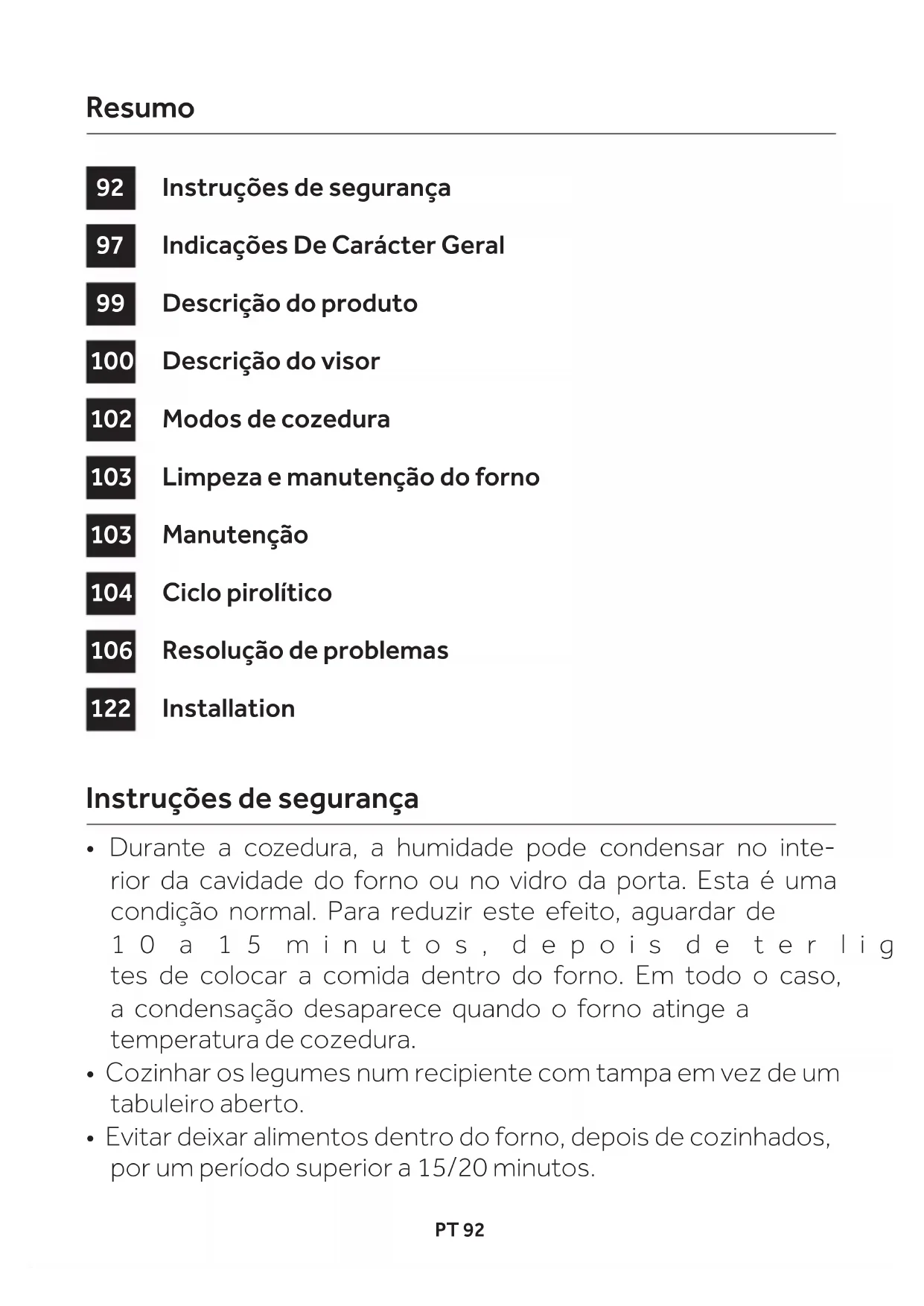 - Evitar deixar alimentos dentro do forno, depois de cozinhados, por um período superior a 15/20 minutos. Instruções de segurançaPT 93