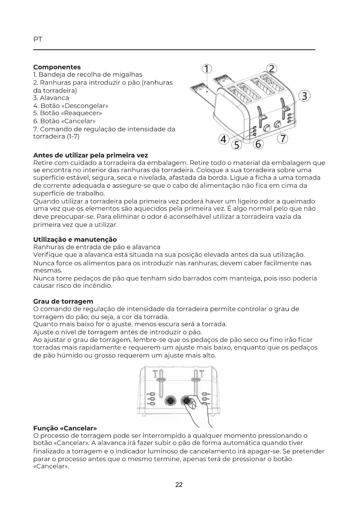 KATEGORIE PRIXTON BIANCA TOASTER HOME Funktion Anheben Dank der Funktion Anheben können Sie mit Hilfe des Hebels das Toastbrot entnehmen. Nachdem der Toastvorgang abgeschlossen ist, drücken Sie den Hebel einfach nach oben, um das Toastbrot anzuheben und leichter entnehmen zu können. Entfernen der krümel Um die Krümel zu entfernen, ziehen Sie das Krümelfach im unteren Bereich des Toasters heraus und entleeren Sie es. Reinigen Sie es und schieben Sie es wieder in den Toaster. Stellen Sie stets sicher, dass Ihr Toaster abgekühlt ist und vom Stromnetz entfernt wurde, bevor Sie die Krümel entfernen. Verwenden Sie den Toaster niemals, wenn das Krümelfach nicht korrekt eingeschoben wurde. Reinigen Sie, wenn möglich vor jedem Gebrauch, das Krümelfach. 21Antes de utilizar pela primeira vez Retire com cuidado a torradeira da embalagem. Retire todo o material da embalagem que se encontra no interior das ranhuras da torradeira. Coloque a sua torradeira sobre uma superfície estável, segura, seca e nivelada, afastada da borda. Ligue a ficha a uma tomada de corrente adequada e assegure-se que o cabo de alimentação não fica em cima da superfície de trabalho. Quando utilizar a torradeira pela primeira vez poderá haver um ligeiro odor a queimado uma vez que os elementos são aquecidos pela primeira vez. É algo normal pelo que não deve preocupar-se. Para eliminar o odor é aconselhável utilizar a torradeira vazia da primeira vez que a utilizar. Utilização e manutenção Ranhuras de entrada de pão e alavanca Verifique que a alavanca está situada na sua posição elevada antes da sua utilização. Nunca force os alimentos para os introduzir nas ranhuras; devem caber facilmente nas mesmas. Nunca torre pedaços de pão que tenham sido barrados com manteiga, pois isso poderia causar risco de incêndio. Grau de torragem O comando de regulação de intensidade da torradeira permite controlar o grau de torragem do pão; ou seja, a cor da torrada. Quanto mais baixo for o ajuste, menos escura será a torrada. Ajuste o nível de torragem antes de introduzir o pão. Ao ajustar o grau de torragem, lembre-se que os pedaços de pão seco ou fino irão ficar torradas mais rapidamente e requerem um ajuste mais baixo, enquanto que os pedaços de pão húmido ou grosso requerem um ajuste mais alto. Função «Cancelar» O processo de torragem pode ser interrompido a qualquer momento pressionando o botão «Cancelar». A alavanca irá fazer subir o pão de forma automática quando tiver finalizado a torragem e o indicador luminoso de cancelamento irá apagar-se. Se pretender parar o processo antes que o mesmo termine, apenas terá de pressionar o botão «Cancelar».
