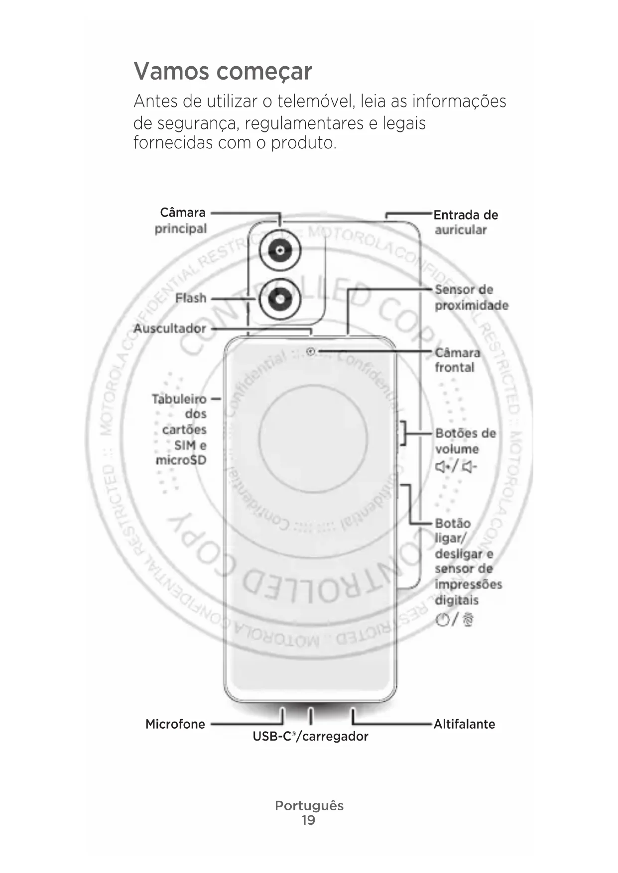em seguida, escreva Informações legais, ou visite www.motorola.com/device-legal. Repelente de água. O telemóvel não é à prova de água. Para obter mais informações sobre o design repelente de água do telemóvel e os cuidados a ter, deslize rapidamente para cima e toque em Definições > Ajuda. Carregamento e segurança da bateria. Para evitar possíveis queimaduras e ferimentos, a bateria do telemóvel apenas deve ser removida por um centro de assistência ou pessoal qualificado aprovados pela Motorola. Se o telemóvel deixar de responder, prima sem soltar o botão ligar/ desligar até que o ecrã se apague e o telemóvel reinicie. Carregue o telemóvel com um carregador Motorola compatível (pode ser vendido em separado). Não é recomendada a utilização de outros carregadores e pode afetar o desempenho do carregamento. Não carregue o telemóvel a temperaturas inferiores a -20 °C (-4 °F) ou superiores a 45 °C (113 °F). Os carregadores que não estiverem em conformidade com as normas nacionais aplicáveis podem não ser seguros, com risco de morte ou danos, e podem provocar um carregamento lento ou danos no produto. Para ver as normas aplicáveis e para saber mais, consulte a secção "Informações legais" deste manual ou visite www.motorola.com/device-legal. Aviso em relação ao volume elevado. Para evitar lesões auditivas, não ouça música a um volume elevado durante longos períodos de tempo. Quando o auricular chega ao limite de volume elevado, é mostrado um aviso. Toque em OK para ignorar, ou aguarde entre um a cinco segundos, e, em seguida, prima o botão de aumentar o volume para ignorar o alerta e permitir que o volume continue a ser ajustado. Eliminação e r eciclagem. Para obter assistência sobre como reciclar produtos e embalagens de forma responsável, visite: www.motorola.com/recycling. Calor ou frio extremo. Não utilize o telemóvel em temperaturas inferiores a -20 °C (-4 °F) ou superiores a 45 °C (113 °F). Não guarde/transporte o telemóvel em temperaturas inferiores a -20 °C (-4 °F) ou superiores a 60 °C (140 °F).22 Avisos legais. As funções, os serviços e as aplicações estão dependentes da rede e poderão não estar disponíveis em todas as áreas. Poderão aplicar-se termos/taxas adicionais. Acredita-se que as especificações do produto e outras informações contidas neste manual são precisas aquando da sua impressão. A Motorola reserva-se o direito de corrigir ou alterar quaisquer informações sem aviso prévio. Arbitragem. A sua compra é regida por uma cláusula de arbitragem vinculativa. Para obter mais informações e saber como exercer a renúncia, leia o guia legal fornecido com o telemóvel. Informações SAR (na etiqueta eletrónica). Para consultar os valores efetivos de taxa de absorção específica (SAR, Specific Absorption Rate) deste telemóvel, deslize rapidamente para cima a partir do ecrã principal, toque em Definições > . Em seguida, escreva Etiquetas regulamentares e *#07# a partir do teclado do telemóvel ou visite www.motorola.com/sar. Potência e frequências suportadas (modelo XT2421-3). Este telemóvel funciona nas seguintes frequências, estando estas sujeitas à localização e disponibilidade de rede. Modo de funcionamento Banda de frequência em MHz/Banda Potência máxima de transmissão nominal em dBm Bluetooth 2400 – 2483,5 20 dBm EIRP Wi-Fi 2400 – 2483,5 20 dBm EIRP Wi-Fi 5150 – 5250 23 dBm EIRP Wi-Fi 5250 – 5350 20 dBm EIRP Wi-Fi 5470 – 5725 20 dBm EIRP Wi-Fi 5725 – 5850 14 dBm EIRP