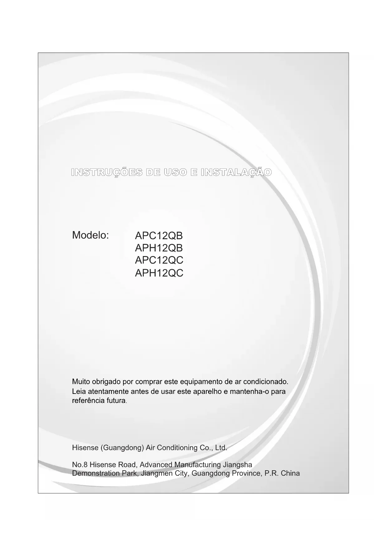 O filtro está sujo ou obstruído por detritos. Limpe o filtro. O ar condicionado funciona, mas não refrigera A saída de ar está bloqueada. Desobstrua a saída de ar. O ar condicionado liga e desliga demais A temperatura definida é muito elevada. Baixe a temperatura definida. O ar condicionado não tem a dimensão própria para a sua divisão. Verifique as capacidades de refrigeração do seu ar condicionado portátil. Os ares condicionados portáteis são projetados como refrigeração suplementar para áreas locais dentro de uma divisão. O filtro está sujo ou obstruído por detritos. Limpe o filtro. Existe calor ou humidade excessiva (cozinhar com recipientes abertos, chuveiros, etc.) na divisão. Use um ventilador para dissipar o calor ou a humidade do ambiente. Tente não usar aparelhos de produção de calor durante as horas mais quentes do dia. Os difusores estão bloqueados. Instale o ar condicionado num local onde os difusores estejam livres de cortinas, persianas, móveis, etc.Merci beaucoup d'avoir acheté ce Climatiseur. Veuillez lire attentivement ces instructions d'utilisation et d'installation avant d'installer et d'utiliser cet appareil et conserver ce manuel pour référence ultérieure. Modèle : Hisense (Guangdong) Air Conditioning Co., Ltd. No.8, Rue de Hisense, Parc de Démonstration de Jiangsha de Fabrication Avancée, Ville de Jiangmen, Province du Guangdong, R.P.Chine APC12QB APH12QB APC12QC APH12QC INSTRUCTIONS D'UTILISATION ET D'INSTALLATION1