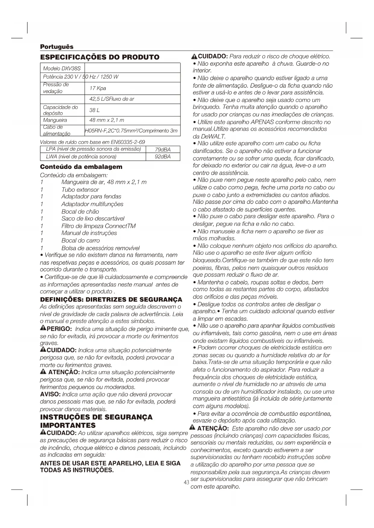 IMPORTANTES Potência 230 V / 50 Hz / 1250 W 17 Kpa 38 L 48 mm x 2,1 m 79dBA H05RN-F,2C*0.75mm²/Comprimento 3m Pressão de vedação 42,5 L/SFluxo de ar Capacidade do depósito Mangueira LPA (nível de pressão sonora da emissão) LWA (nível de potência sonora) 92dBA Cabo de alimentação Valores de ruído com base em EN60335-2-69 As denições apresentadas sem seguida descrevem o nível de gravidade de cada palavra de advertência. Leia o manual e preste atenção a estes símbolos. PERIGO: Indica uma situação de perigo iminente que, se não for evitada, irá provocar a morte ou ferimentos graves. CUIDADO: Indica uma situação potencialmente perigosa que, se não for evitada, poderá provocar a morte ou ferimentos graves. ATENÇÃO: Indica uma situação potencialmente perigosa que, se não for evitada, poderá provocar ferimentos pequenos ou moderados. AVISO: Indica uma ação que não deverá provocar danos pessoais mas que, se não for evitada, poderá provocar danos materiais. CUIDADO: Ao utilizar aparelhos elétricos, siga sempre as precauções de segurança básicas para reduzir o risco de incêndio, choque elétrico e danos pessoais, incluindo as indicadas em seguida: ATENÇÃO: Este aparelho não deve ser usado por pessoas (incluindo crianças) com capacidades físicas, sensoriais ou mentais reduzidas, ou sem experiência e conhecimentos, exceto quando estiverem a ser supervisionadas ou tenham recebido instruções sobre a utilização do aparelho por uma pessoa que se responsabilize pela sua segurança.As crianças devem ser supervisionadas para assegurar que não brincam com este aparelho. CUIDADO: Para reduzir o risco de choque elétrico.
