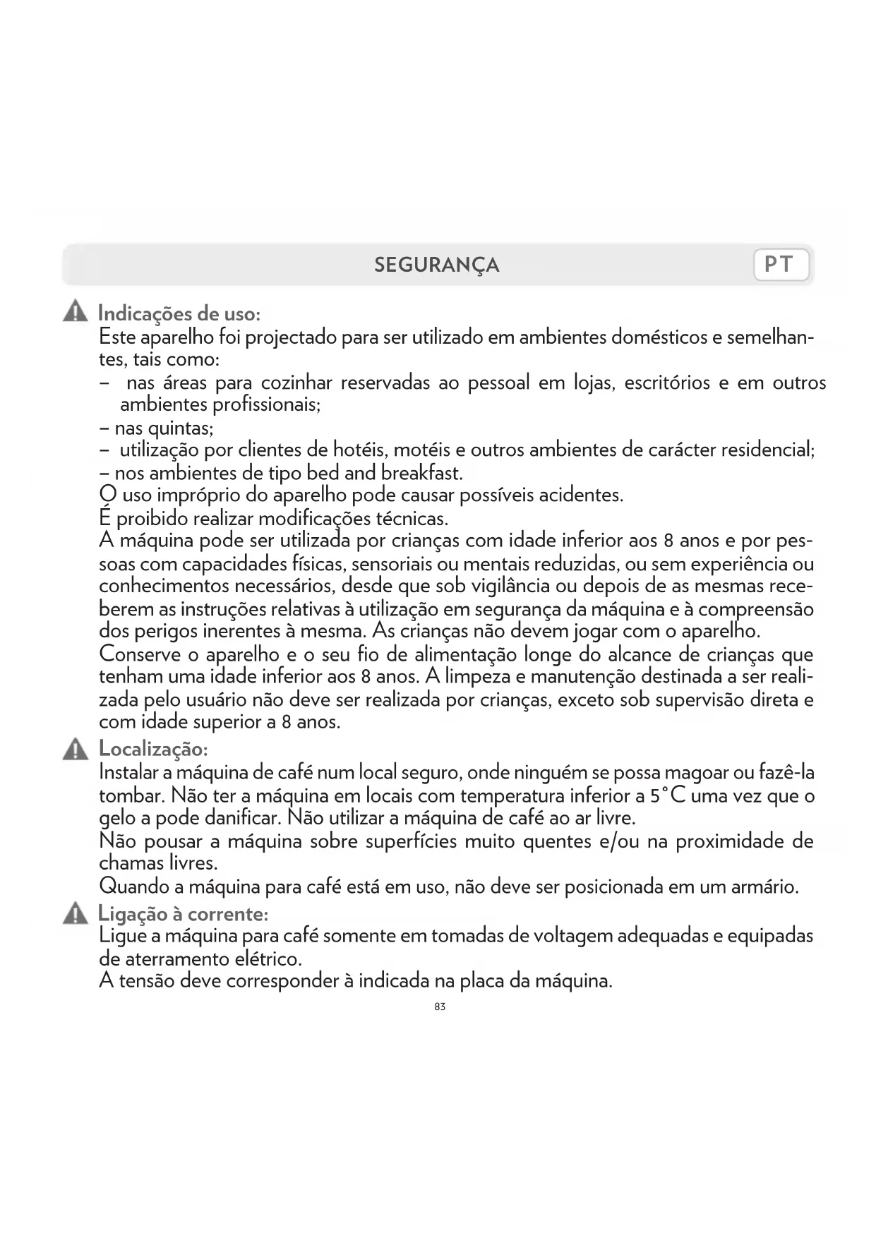 Em caso de avaria, defeitos ou suspeita de defeitosAFPOs de uma queda, retirar de imeditato a ficha da tomada. Nao colocar em funcaoamento umaquina com defeito. Apenas os Centros de Assistencia Tecnica Autorizados Lavazza podem efectuar intervenções e reparacoes. Casa ocorram intervenções que nao estejam em conformidade com as normas do sector, declina-se qualquer responsabuldade por eventuais danos.