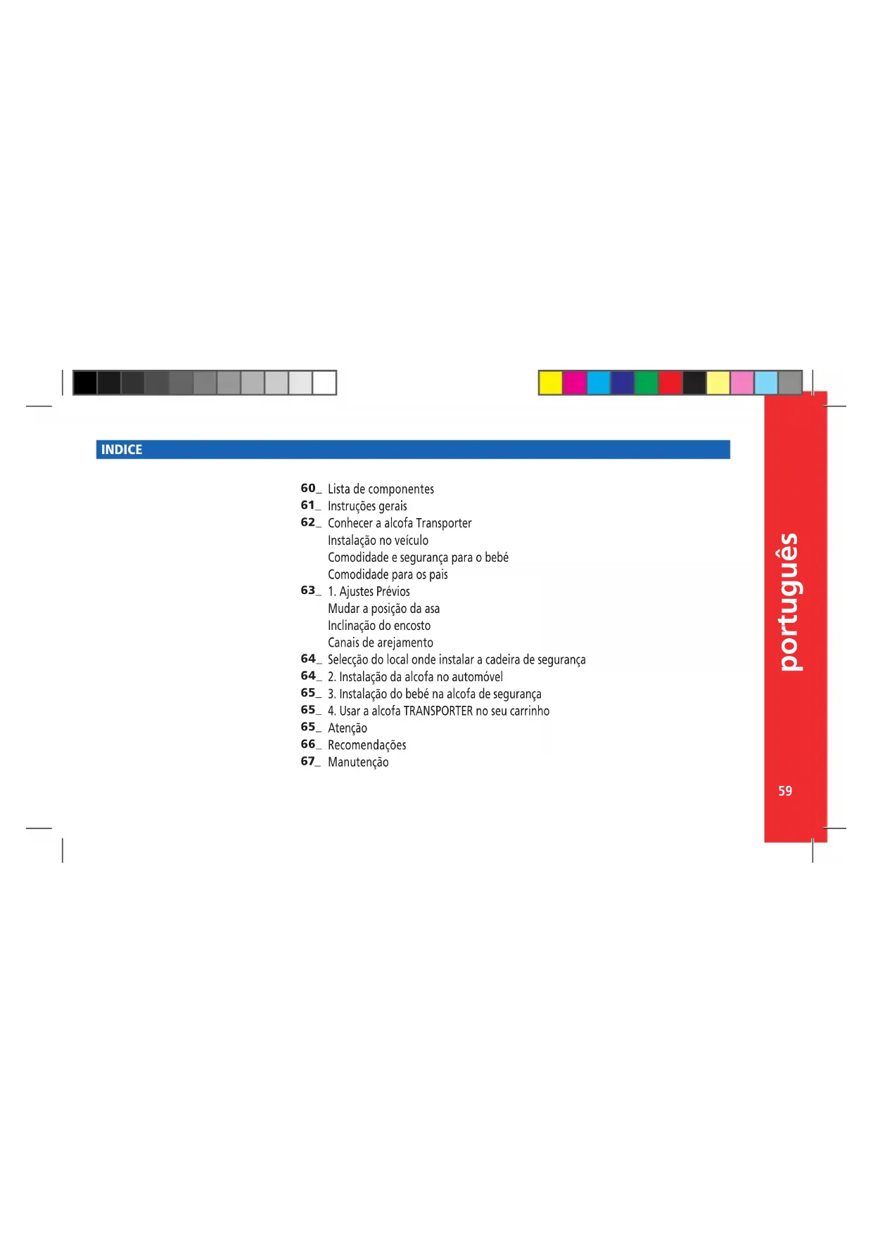 INDICE Lista de componentes Instruções gerais Conhecer a alcofa Transporter Instalação no veículo Comodidade e segurança para o bebé Comodidade para os pais