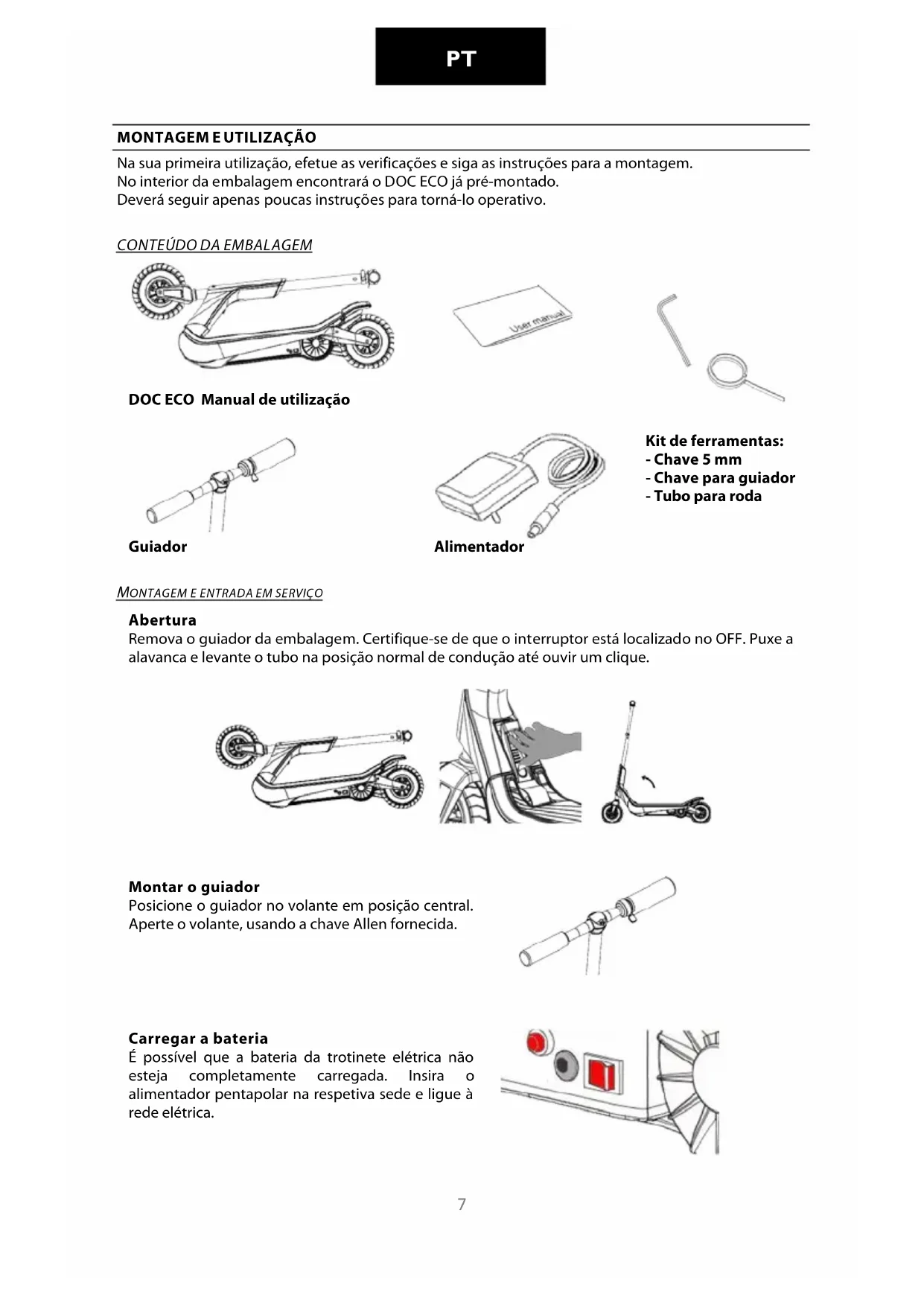 PREFÁCIO Obrigado por ter comprado o DOC ECO, um meio de transporte prático e compacto para as deslocações breves ou simplesmente para se divertir na cidade. O DOC ECO respeita o ambiente, não polui e não é ruidoso. Com um custo diário de poucos cêntimos, satisfará as suas exigências de deslocação, com uma notável dose de diversão. O DOC ECO levá-lo-á a qualquer ponto da cidade com uma só carga. Fácil de transportar graças ao seu mecanismo de dobragem rápida. É possível facilitar o movimento do DOC ECO nos percursos inclinados, empurrando com os pés e usando-o como uma trotinete tradicional. Certifique-se de que usa o DOC ECO de forma segura e preste sempre atenção aos peões. Informe-se e respeite as normas aplicáveis à utilização do DOC ECO no local em que se encontra.