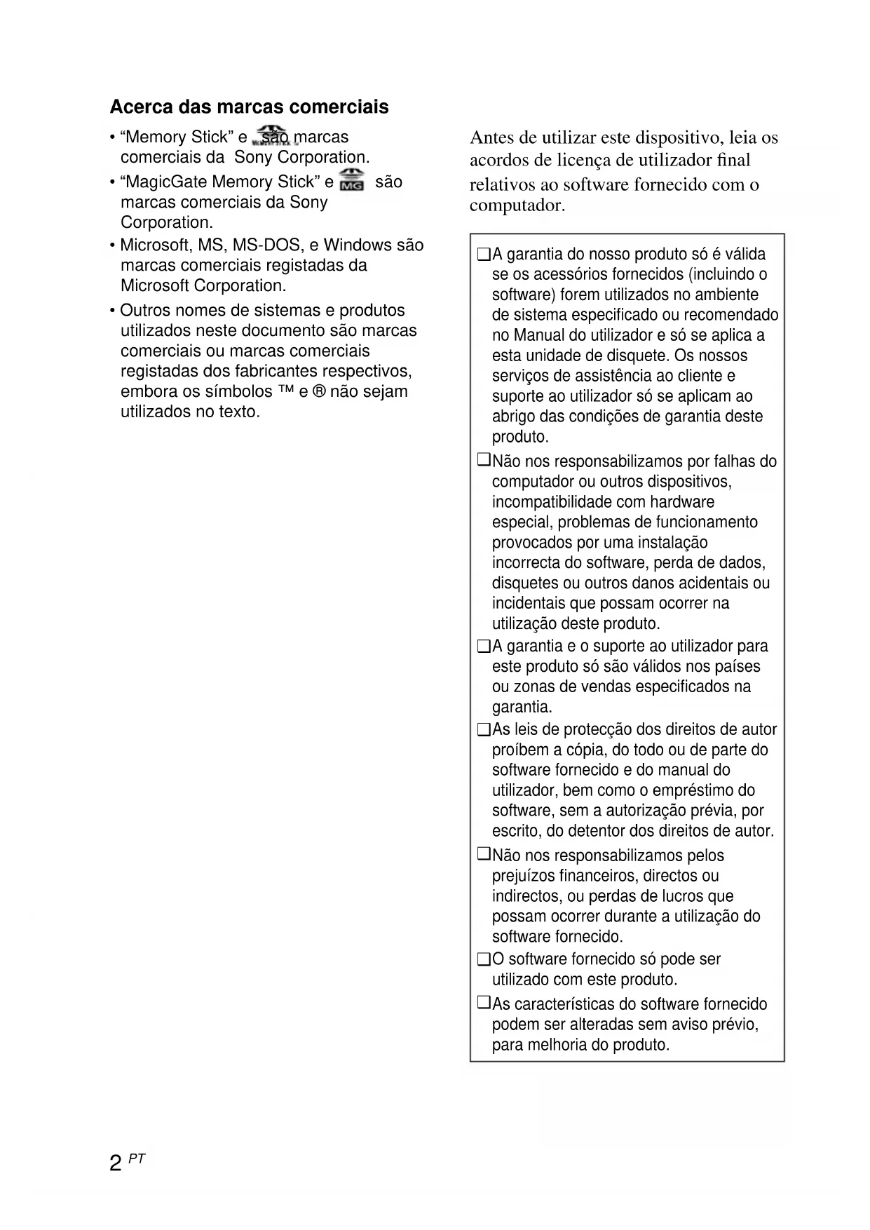 Acordo De Licença De Utilizador Final AVISO IMPORTANTE Este “ACORDO DE LICENÇA DE UTILIZADOR FINAL” aplica-se ao software de controlador de dispositivo para unidade de disquete USB fornecido pela Sony. Leia este