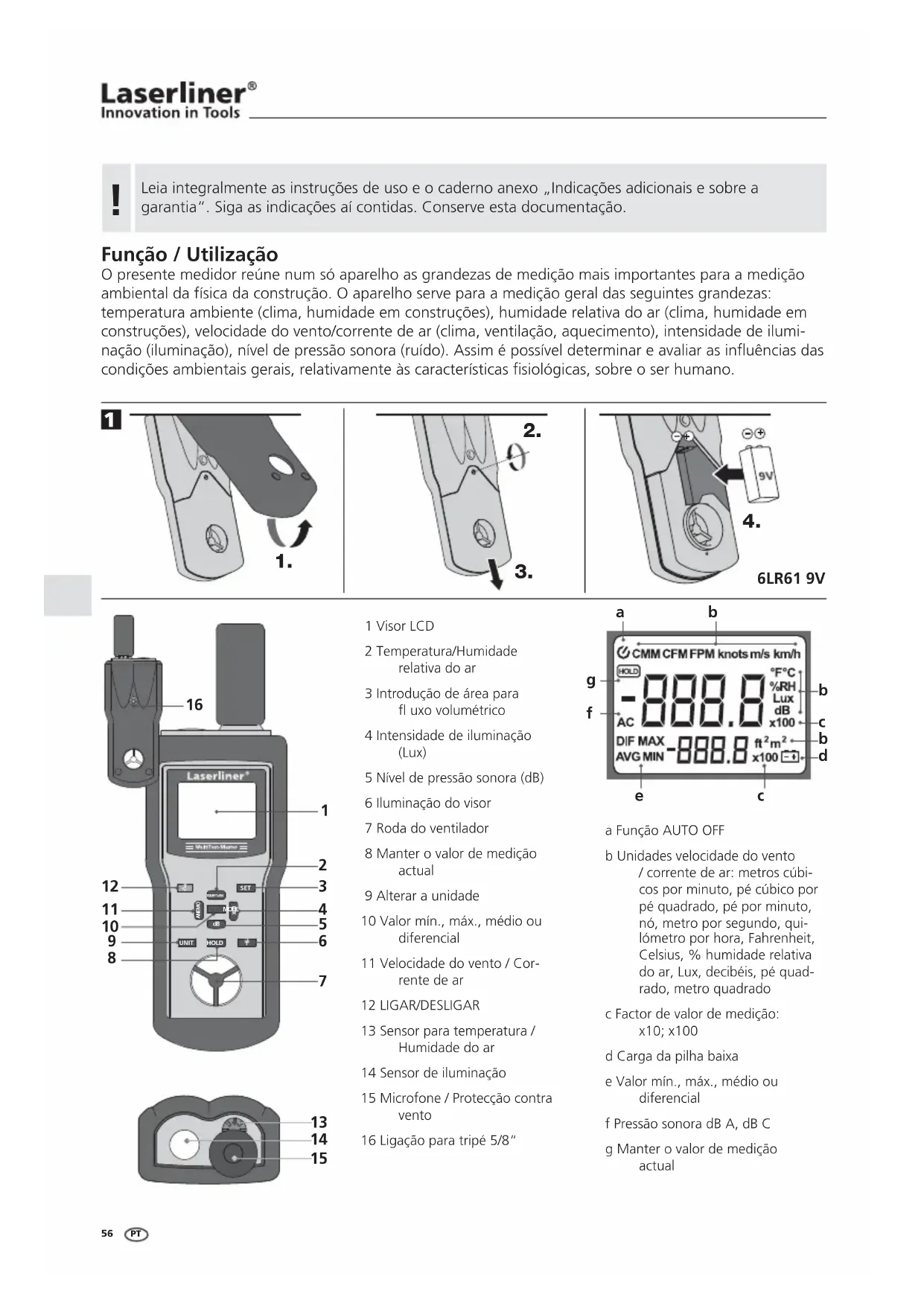 1 Visor LCD 2 Temperatura/Humidade relativa do ar 3 Introdução de área para × uxo volumétrico 4 Intensidade de iluminação (Lux) 5 Nível de pressão sonora (dB) 6 Iluminação do visor 7 Roda do ventilador 8 Manter o valor de medição actual 9 Alterar a unidade 10 Valor mín., máx., médio ou diferencial 11 Velocidade do vento / Cor- rente de ar 12 LIGAR/DESLIGAR 13 Sensor para temperatura / Humidade do ar 14 Sensor de iluminação 15 Microfone / Protecção contra vento 16 Ligação para tripé 5/8“ a Função AUTO OFF b Unidades velocidade do vento / corrente de ar: metros cúbi- cos por minuto, pé cúbico por pé quadrado, pé por minuto, nó, metro por segundo, qui- lómetro por hora, Fahrenheit, Celsius, % humidade relativa do ar, Lux, decibéis, pé quad- rado, metro quadrado c Factor de valor de medição: x10; x100 d Carga da pilha baixa e Valor mín., máx., médio ou diferencial f Pressão sonora dB A, dB C g Manter o valor de medição actual