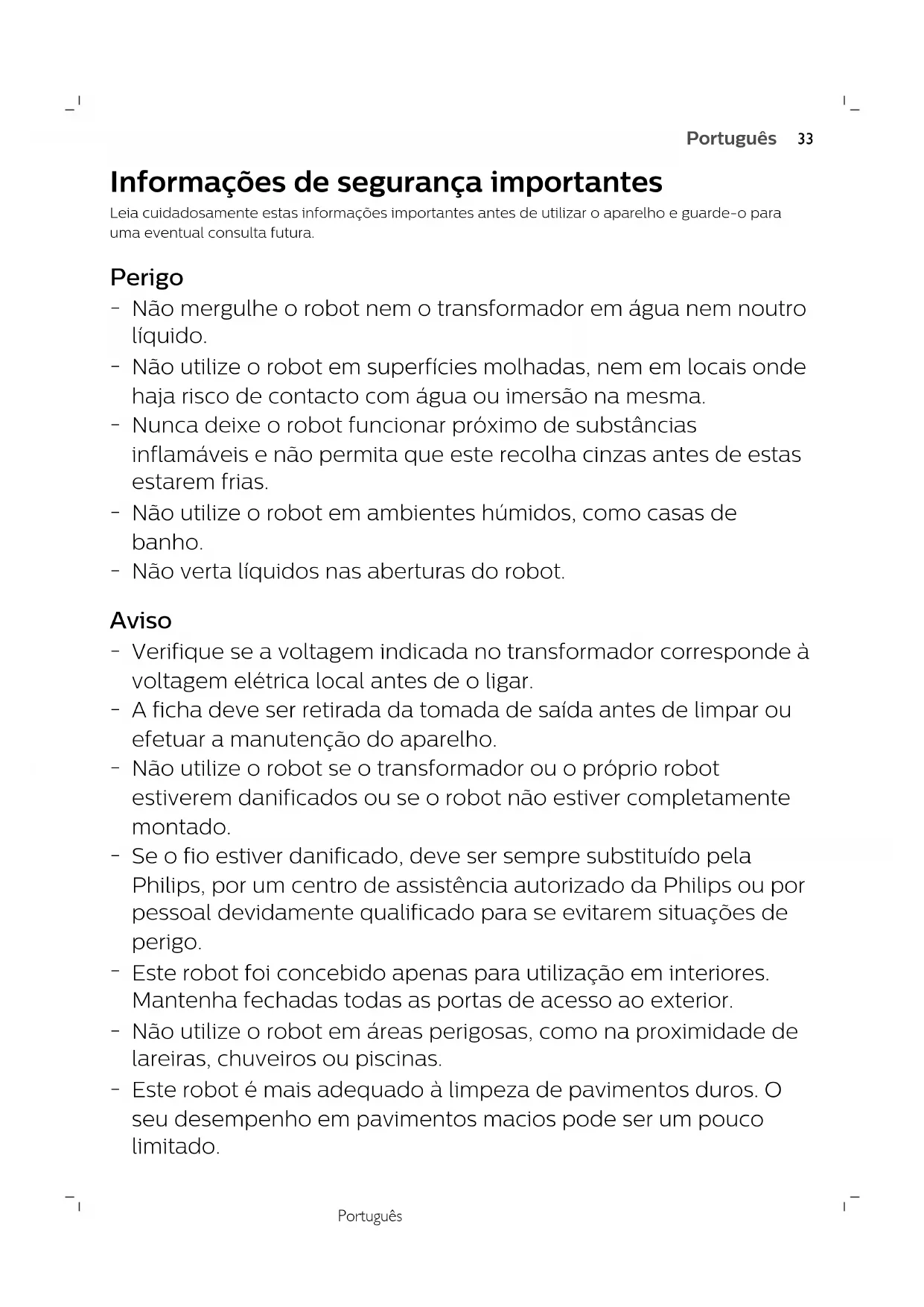 Não utilize o robot em áreas perigosas, como na proximidade de lareiras, chuveiros ou piscinas.