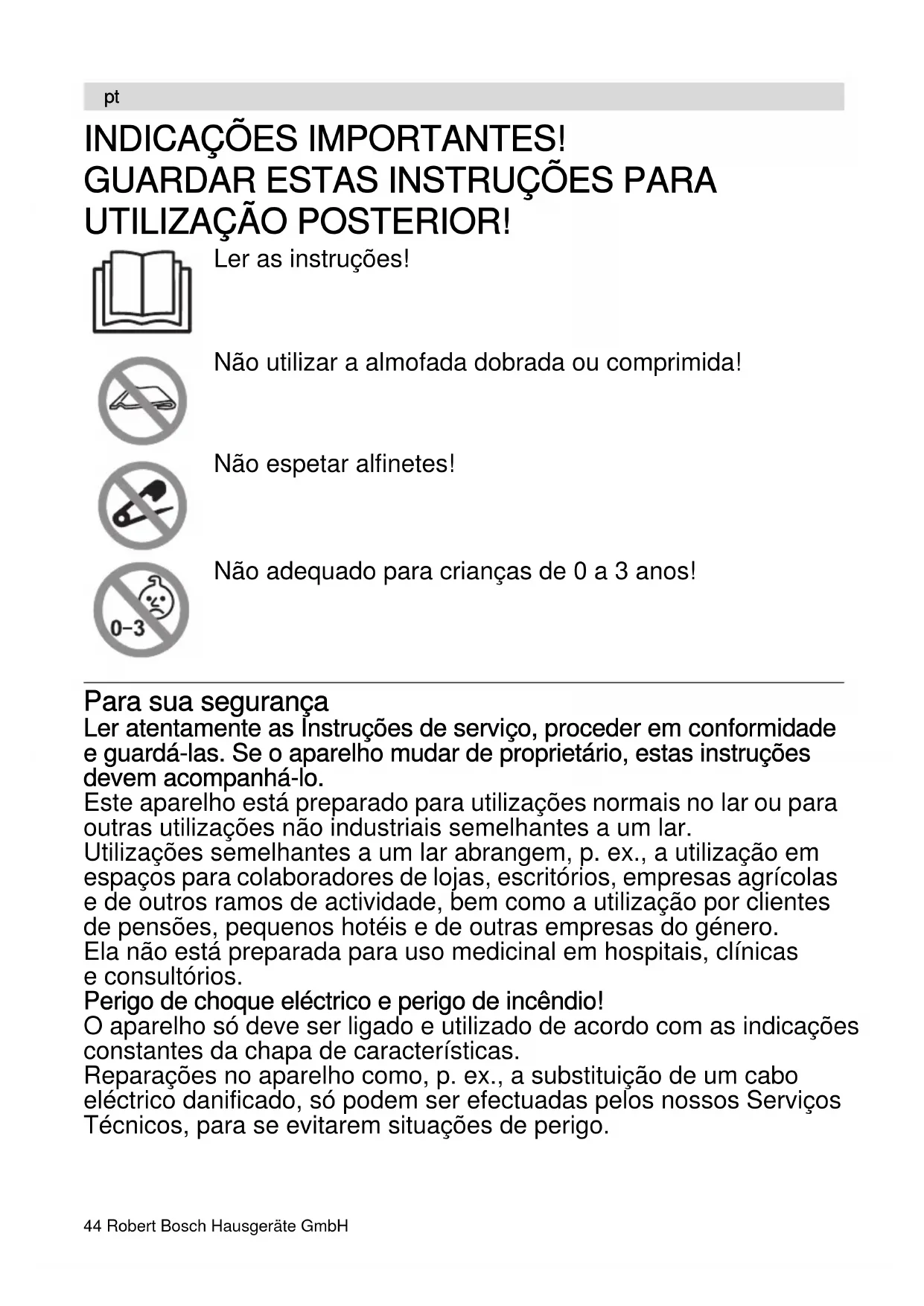 UTILIZAÇÃO POSTERIOR! Ler as instruções! Não utilizar a almofada dobrada ou comprimida! Não espetar alfinetes! Não adequado para crianças de 0 a 3 anos! Para sua segurança Ler atentamente as Instruções de serviço, proceder em conformidade e guardá-las. Se o aparelho mudar de proprietário, estas instruções devem acompanhá-lo. Este aparelho está preparado para utilizações normais no lar ou para outras utilizações não industriais semelhantes a um lar. Utilizações semelhantes a um lar abrangem, p. ex., a utilização em espaços para colaboradores de lojas, escritórios, empresas agrícolas e de outros ramos de actividade, bem como a utilização por clientes de pensões, pequenos hotéis e de outras empresas do género. Ela não está preparada para uso medicinal em hospitais, clínicas e consultórios. Perigo de choque eléctrico e perigo de incêndio! O aparelho só deve ser ligado e utilizado de acordo com as indicações constantes da chapa de características. Reparações no aparelho como, p. ex., a substituição de um cabo eléctrico danificado, só podem ser efectuadas pelos nossos Serviços Técnicos, para se evitarem situações de perigo. ptRobert Bosch Hausgeräte GmbH 45 A utilização desta almofada eléctrica não é permitida a crianças com menos de 3 anos, pois não conseguem reagir a um sobreaqueci- mento. Não é permitido que crianças com menos de 8 anos utilizem o apa- relho, a não ser que um pai ou encarregado de educação tenham colocado o regulador de calor no nível de temperatura mais baixo. Este aparelho pode ser utilizado por crianças a partir dos 8 anos e por pessoas com capacidades físicas, sensoriais ou mentais reduzidas ou com falta de experiência e/ou conhecimentos, se forem devidamente supervisadas ou instruídas na utilização com segurança do aparelho e tiverem compreendido os perigos daí resultantes. Crianças não podem brincar com o aparelho. A limpeza e a manutenção a ser efectuada pelo utilizador não devem ser executadas por crianças, a não ser que tenham 8 ou mais anos de idade e se encontrem sob vigilância. Perigo de sobreaquecimento! Se o aparelho estiver ligado por um longo período de tempo, deve ser seleccionada a regulação para funcionamento contínuo com o regulador térmico. Perigo de ferimentos A almofada eléctrica não deve ser usada por pessoas não sensíveis ao calor nem por outras pessoas que careçam de protecção e que possam não reagir a um sobreaquecimento. Símbolos Não lavar! Lavar a 40 °C! Não secar na máquina! Secar na máquina! Não passar a ferro! Passar a baixa temperatura! Não é permitido branquear! Não limpar com produtos químicos! Outras indicações de segurança Deve-se verificar frequentemente se o aparelho apresenta sinais de desgaste ou dano. Nesse caso ou se o aparelho for indevida- mente utilizado ou não funcionar, ele deve ser devolvido ao comerciante antes de ser novamente utilizado. Utilizar o aparelho somente, se o cabo de ali- mentação ou o próprio aparelho não apresen- tarem quaisquer danos. Após cada utilização e em caso de anomalia, desligar imediatamente a ficha da tomada. Não enrolar o cabo eléctrico em volta do regu- lador térmico. Não tapar o regulador térmico! Para assegurar o correcto funcionamento do regulador térmico, este não deve ser colocado nem por cima nem por baixo da almofada, nem mesmo ser tapado por outros objectos. pt46 Robert Bosch Hausgeräte GmbH São provenientes do aparelho campos eléctri- cos e magnéticos muito fracos que, eventual- mente, podem afectar o funcionamento de um estimulador cardíaco (= pacemaker). Por isso recomendamos, antes da utilização, o contacto com um médico ou com o fabri- cante do estimulador cardíaco. O regulador de calor e o respectivo cabo do aparelho devem estar dispostos de modo a evitar qualquer perigo de estrangulamento, tropeço ou semelhante. A utilização contínua com uma regulação elevada pode provocar queimaduras na pele. É indispensável assegurar que o utilizador não adormeça enquanto usa a almofada! Utilizar apenas a almofada eléctrica em com- partimentos secos (não na casa de banho ou similares). A almofada eléctrica só deve ser utilizada sob vigilância, desligar caso saia da divisão onde se encontra a almofada. Não amarrotar a almofada! Deve-se evitar dobrar vincadamente o aparelho, não o guardando por baixo de outros objectos. Nunca utilizar a almofada quando húmida ou molhada, primeiro deverá deixá-la secar completamente. Não utilizar em animais. Perigo de asfixia! Não deixar crianças brincarem com o material da embalagem. Componentes e elementos de comando Fig. 1 1 Almofada eléctrica 2 Fronha de tecido 3 Regulador térmico 4 Lâmpada de controlo Possibilidades de utilização A almofada eléctrica destina-se a ser utilizada nas seguintes partes do corpo: Braços, costas, barriga, ombros, coxas, barriga das pernas, etc. Colocação em funcionamento Introduzir a almofada eléctrica (N) na fronha de tecido (O). Certificar-se de que o cabo eléctrico e o regulador térmico (P) ficam fora da fronha (O). Fechar o fecho de velcro ou de correr. No regulador térmico (P) regular a temperatura pretendida. Importante: Para o funcionamento contínuo, recomenda- se o posicionamento do regulador térmico na primeira fase. Fig. 2 Com a regulação da temperatura no regulador térmico (P), a almofada eléctrica fica ligada e a lâmpada de controlo (Q) acende. Fig. 3 Se o regulador térmico (P) estiver na posição «0», isso significa que a almofada está desligada e a lâmpada de controlo (Q) apagada. Desligar automático A almofada eléctrica desliga automaticamente após cerca de 90 minutos de funcionamento contínuo, para evitar um funcionamento não vigiado. A lâmpada de controlo começa a piscar. Para voltar a ligar a almofada, posicionar, primeiro, o regulador térmico em «0» e, depois, voltar a regular a temperatura pretendida. Depois da utilizaçã