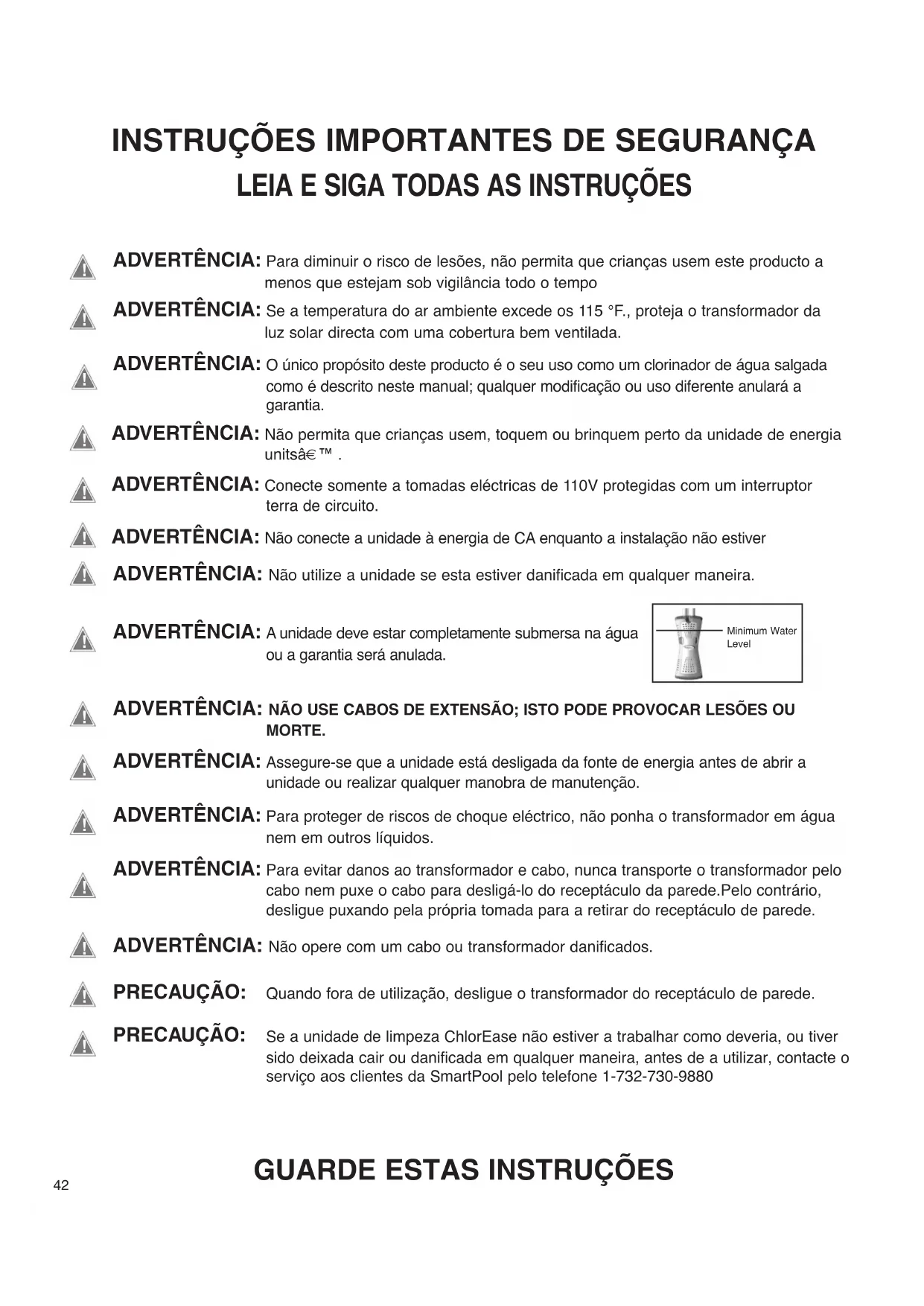 PRECAUÇÂO: Se a unidade de limpeza ChlorEase não estiver a trabalho como deveria, ou tiver sido deixada cair ou danificada em qualquer maneira, antes de autilizar, contacte o服务于 os clients da SmartPoolelo telephone 1-732-730-9880
