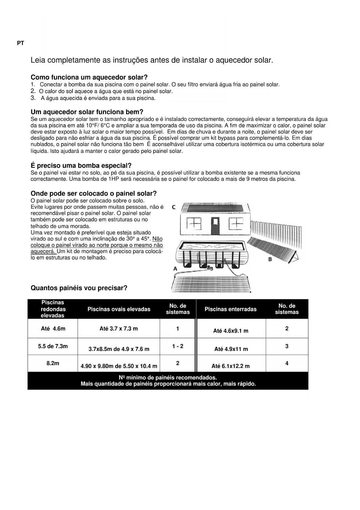 A água aquecida é enviada para a sua piscina. Um aquecedor solar funciona bem? Se um aquecedor solar tem o tamanho apropriado e é instalado correctamente, conseguirá elevar a temperatura da água da sua piscina em até 10°F/ 6°C e ampliar a sua temporada de uso da piscina. A fim de maximizar o calor, o painel solar deve estar exposto à luz solar o maior tempo possível. Em dias de chuva e durante a noite, o painel solar deve ser desligado para não esfriar a água da sua piscina. É possível comprar um kit bypass para complementá-lo. Em dias nublados, o painel solar não funciona tão bem É aconselhável utilizar uma cobertura isotérmica ou uma cobertura solar líquida. Isto ajudará a manter o calor gerado pelo painel solar. É preciso uma bomba especial? Se o painel vai estar no solo, ao pé da sua piscina, é possível utilizar a bomba existente se a mesma funciona correctamente. Uma bomba de 1HP será necessária se o painel for colocado a mais de 9 metros da piscina. Onde pode ser colocado o painel solar? O painel solar pode ser colocado sobre o solo. Evite lugares por onde passem muitas pessoas, não é recomendável pisar o painel solar. O painel solar também pode ser colocado em estruturas ou no telhado de uma morada. Uma vez montado é preferível que esteja situado virado ao sul e com uma inclinação de 30° a 45°. Não coloque o painel virado ao norte porque o mesmo não aquecerá. Um kit de montagem é preciso para colocá- lo em estruturas ou no telhado.