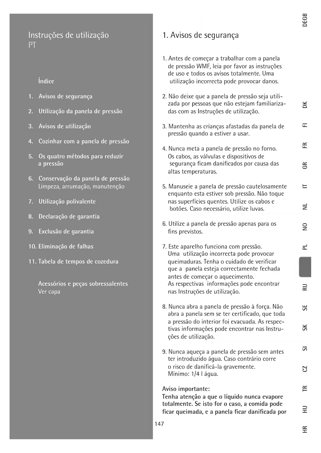 esta ou partes dela estiverem danificadas ou deformadas, ou quando a sua função não corresponde ao descrito nas Instruções de utilização. Nestes casos dirija-se à loja WMF mais próxima. Por favor guarde estas Instruções de utilização cuidadosamente.149 DEGBESBG DKFI