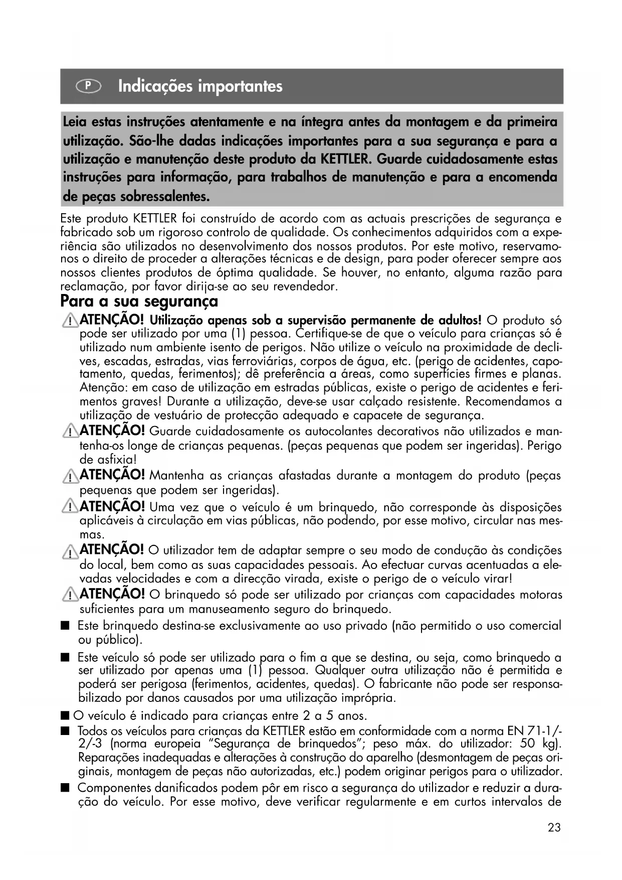 PL23 Este produto KETTLER foi construído de acordo com as actuais prescrições de segurança e fabricado sob um rigoroso controlo de qualidade. Os conhecimentos adquiridos com a expe- riência são utilizados no desenvolvimento dos nossos produtos. Por este motivo, reservamo- nos o direito de proceder a alterações técnicas e de design, para poder oferecer sempre aos nossos clientes produtos de óptima qualidade. Se houver, no entanto, alguma razão para reclamação, por favor dirija-se ao seu revendedor. Para a sua segurança ATENÇÃO! Utilização apenas sob a supervisão permanente de adultos! O produto só pode ser utilizado por uma (1) pessoa. Certifique-se de que o veículo para crianças só é utilizado num ambiente isento de perigos. Não utilize o veículo na proximidade de decli- ves, escadas, estradas, vias ferroviárias, corpos de água, etc. (perigo de acidentes, capo- tamento, quedas, ferimentos); dê preferência a áreas, como superfícies firmes e planas. Atenção: em caso de utilização em estradas públicas, existe o perigo de acidentes e feri- mentos graves! Durante a utilização, deve-se usar calçado resistente. Recomendamos a utilização de vestuário de protecção adequado e capacete de segurança. ATENÇÃO! Guarde cuidadosamente os autocolantes decorativos não utilizados e man- tenha-os longe de crianças pequenas. (peças pequenas que podem ser ingeridas). Perigo de asfixia! ATENÇÃO! Mantenha as crianças afastadas durante a montagem do produto (peças pequenas que podem ser ingeridas). ATENÇÃO! Uma vez que o veículo é um brinquedo, não corresponde às disposições aplicáveis à circulação em vias públicas, não podendo, por esse motivo, circular nas mes- mas. ATENÇÃO! O utilizador tem de adaptar sempre o seu modo de condução às condições do local, bem como as suas capacidades pessoais. Ao efectuar curvas acentuadas a ele- vadas velocidades e com a direcção virada, existe o perigo de o veículo virar! ATENÇÃO! O brinquedo só pode ser utilizado por crianças com capacidades motoras suficientes para um manuseamento seguro do brinquedo. ■ Este brinquedo destina-se exclusivamente ao uso privado (não permitido o uso comercial ou público). ■ Este veículo só pode ser utilizado para o fim a que se destina, ou seja, como brinquedo a ser utilizado por apenas uma (1) pessoa. Qualquer outra utilização não é permitida e poderá ser perigosa (ferimentos, acidentes, quedas). O fabricante não pode ser responsa- bilizado por danos causados por uma utilização imprópria. ■ O veículo é indicado para crianças entre 2 a 5 anos. ■ Todos os veículos para crianças da KETTLER estão em conformidade com a norma EN 71-1/- 2/-3 (norma europeia “Segurança de brinquedos”; peso máx. do utilizador: 50 kg). Reparações inadequadas e alterações à construção do aparelho (desmontagem de peças ori- ginais, montagem de peças não autorizadas, etc.) podem originar perigos para o utilizador. ■ Componentes danificados podem pôr em risco a segurança do utilizador e reduzir a dura- ção do veículo. Por esse motivo, deve verificar regularmente e em curtos intervalos de Leia estas instruções atentamente e na íntegra antes da montagem e da primeira utilização. São-lhe dadas indicações importantes para a sua segurança e para a utilização e manutenção deste produto da KETTLER. Guarde cuidadosamente estas instruções para informação, para trabalhos de manutenção e para a encomenda de peças sobressalentes.