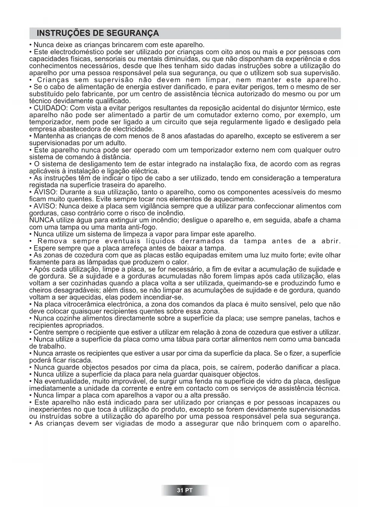 - Mantenha sempre afastado da superficie de cozedura da placar qualquer objecto, material ou substancia passivel de derreter, como, por exemple, artigos de plastico, acucar ou produits com um teor elevado de acucar.