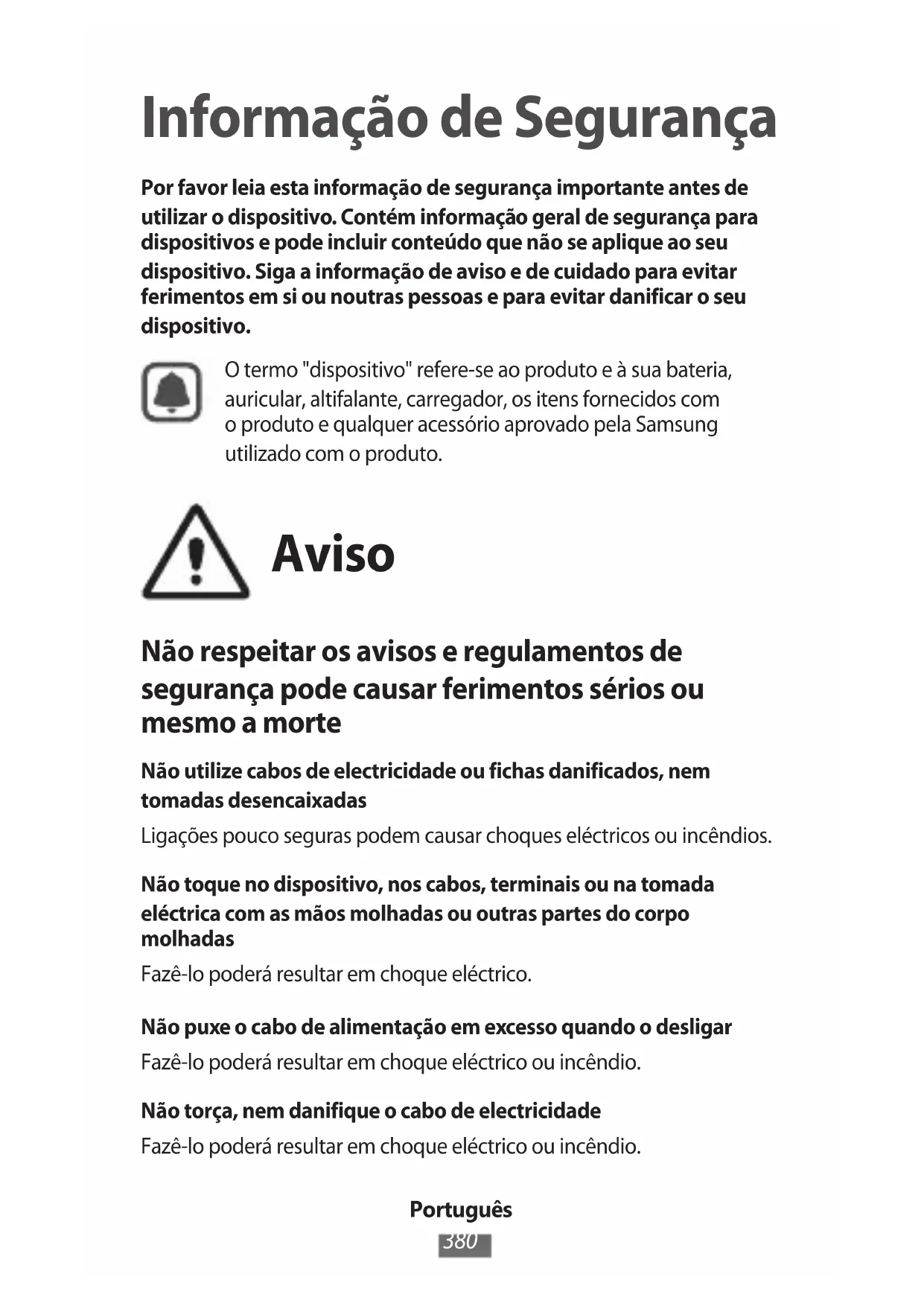 Informação de Segurança Por favor leia esta informação de segurança importante antes de utilizar o dispositivo. Contém informação geral de segurança para dispositivos e pode incluir conteúdo que não se aplique ao seu dispositivo. Siga a informação de aviso e de cuidado para evitar ferimentos em si ou noutras pessoas e para evitar danificar o seu dispositivo. O termo "dispositivo" refere-se ao produto e à sua bateria, auricular, altifalante, carregador, os itens fornecidos com o produto e qualquer acessório aprovado pela Samsung utilizado com o produto. Aviso Não respeitar os avisos e regulamentos de segurança pode causar ferimentos sérios ou mesmo a morte Não utilize cabos de electricidade ou fichas danificados, nem tomadas desencaixadas Ligações pouco seguras podem causar choques eléctricos ou incêndios. Não toque no dispositivo, nos cabos, terminais ou na tomada eléctrica com as mãos molhadas ou outras partes do corpo molhadas Fazê-lo poderá resultar em choque eléctrico. Não puxe o cabo de alimentação em excesso quando o desligar Fazê-lo poderá resultar em choque eléctrico ou incêndio. Não torça, nem danifique o cabo de electricidade Fazê-lo poderá resultar em choque eléctrico ou incêndio.Português
