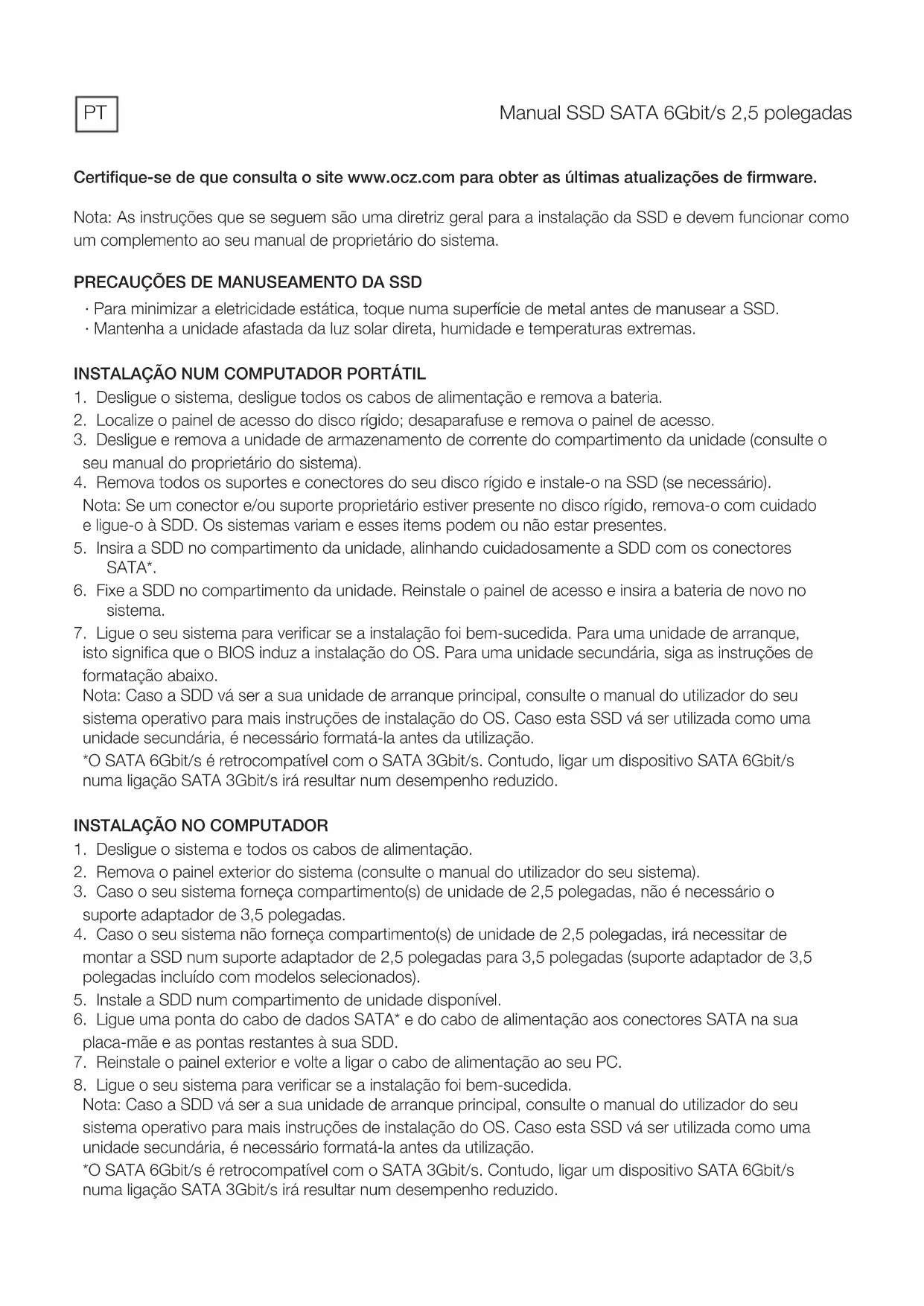 Nota: Caso a SDD vá ser a sua unidade de arranque principal, consulte o manual do utilizador do seu sistema operativo para mais instruções de instalação do OS. Caso esta SSD vá ser utilizada como uma unidade secundária, é necessário formatá-la antes da utilização. *O SATA 6Gbit/s é retrocompatível com o SATA 3Gbit/s. Contudo, ligar um dispositivo SATA 6Gbit/s numa ligação SATA 3Gbit/s irá resultar num desempenho reduzido. Manual SSD SATA 6Gbit/s 2,5 polegadas