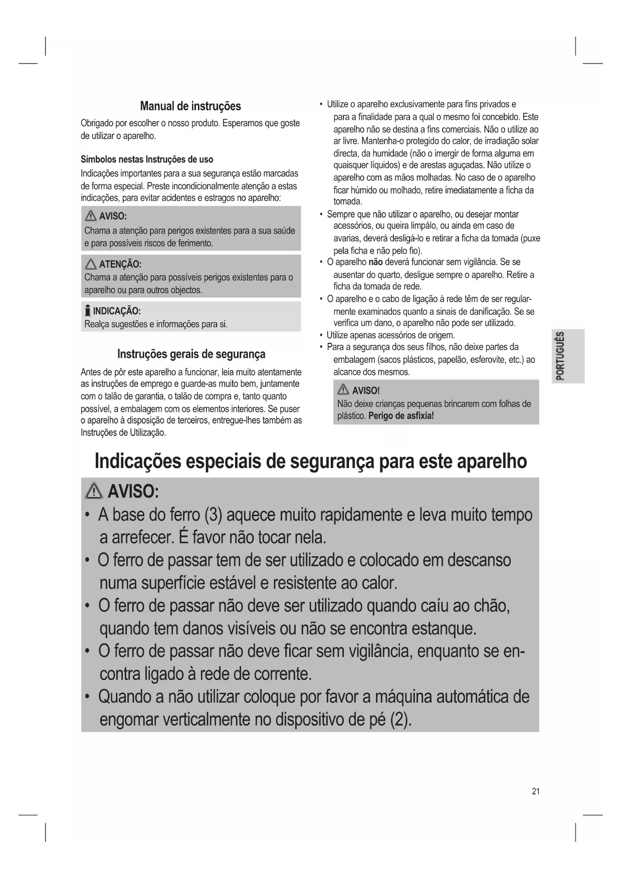 - Quando a não utilizar coloque por favor a máquina automática de engomar verticalmente no dispositivo de pé (2).22 AVISO: