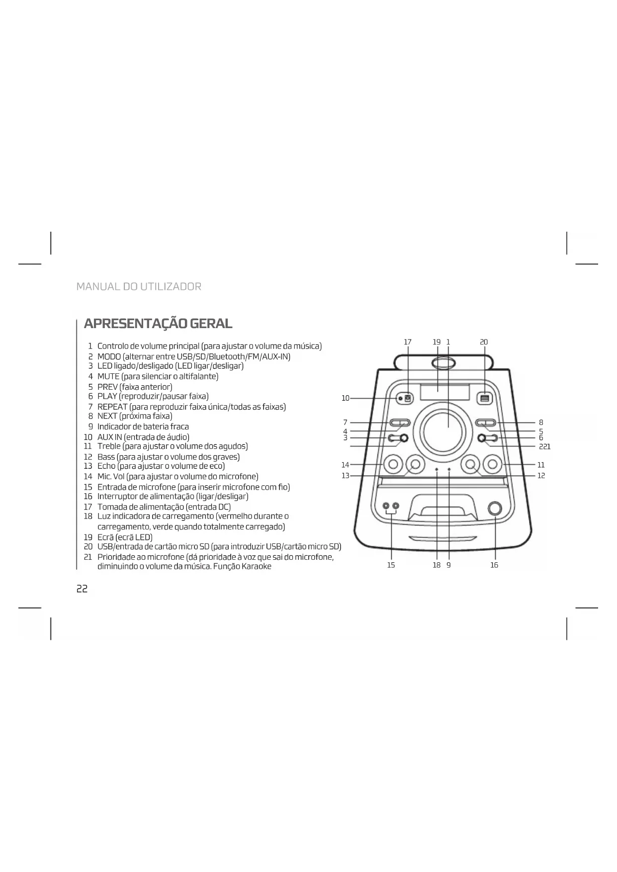 Controlo de volume principal (para ajustar o volume da música) MODO (alternar entre USB/SD/Bluetooth/FM/AUX-IN) LED ligado/desligado (LED ligar/desligar) MUTE (para silenciar o altifalante) PREV (faixa anterior) PLAY (reproduzir/pausar faixa) REPEAT (para reproduzir faixa única/todas as faixas) NEXT (próxima faixa) Indicador de bateria fraca AUX IN (entrada de áudio) Treble (para ajustar o volume dos agudos) Bass (para ajustar o volume dos graves) Echo (para ajustar o volume de eco) Mic. Vol (para ajustar o volume do microfone) Entrada de microfone (para inserir microfone com fio) Interruptor de alimentação (ligar/desligar) Tomada de alimentação (entrada DC) Luz indicadora de carregamento (vermelho durante o carregamento, verde quando totalmente carregado) Ecrã (ecrã LED) USB/entrada de cartão micro SD (para introduzir USB/cartão micro SD) Prioridade ao microfone (dá prioridade à voz que sai do microfone, diminuindo o volume da música. Função Karaoke
