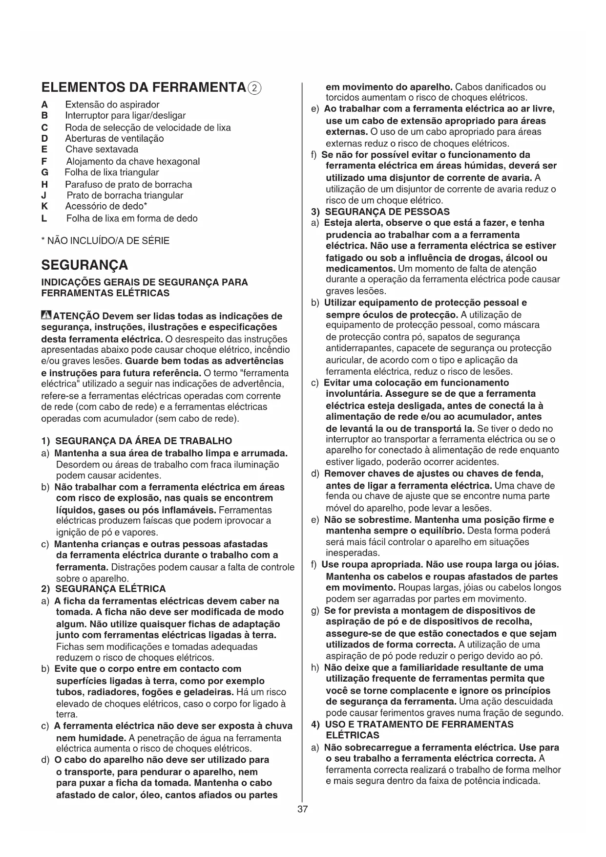 A Extensão do aspirador B Interruptor para ligar/desligar C Roda de selecção de velocidade de lixa D Aberturas de ventilação E Chave sextavada F Alojamento da chave hexagonal G Folha de lixa triangular H Parafuso de prato de borracha J Prato de borracha triangular K Acessório de dedo* L Folha de lixa em forma de dedo