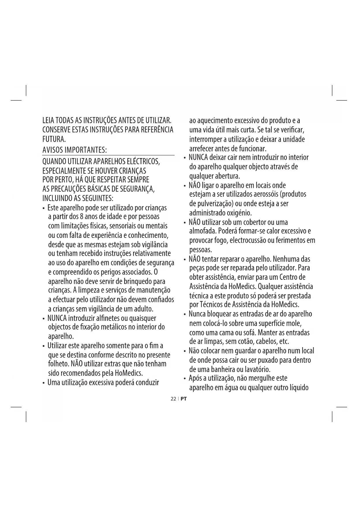 - NÃO tentar reparar o aparelho. Nenhuma das peças pode ser reparada pelo utilizador. Para obter assistência, enviar para um Centro de Assistência da HoMedics. Qualquer assistência técnica a este produto só poderá ser prestada por Técnicos de Assistência da HoMedics.